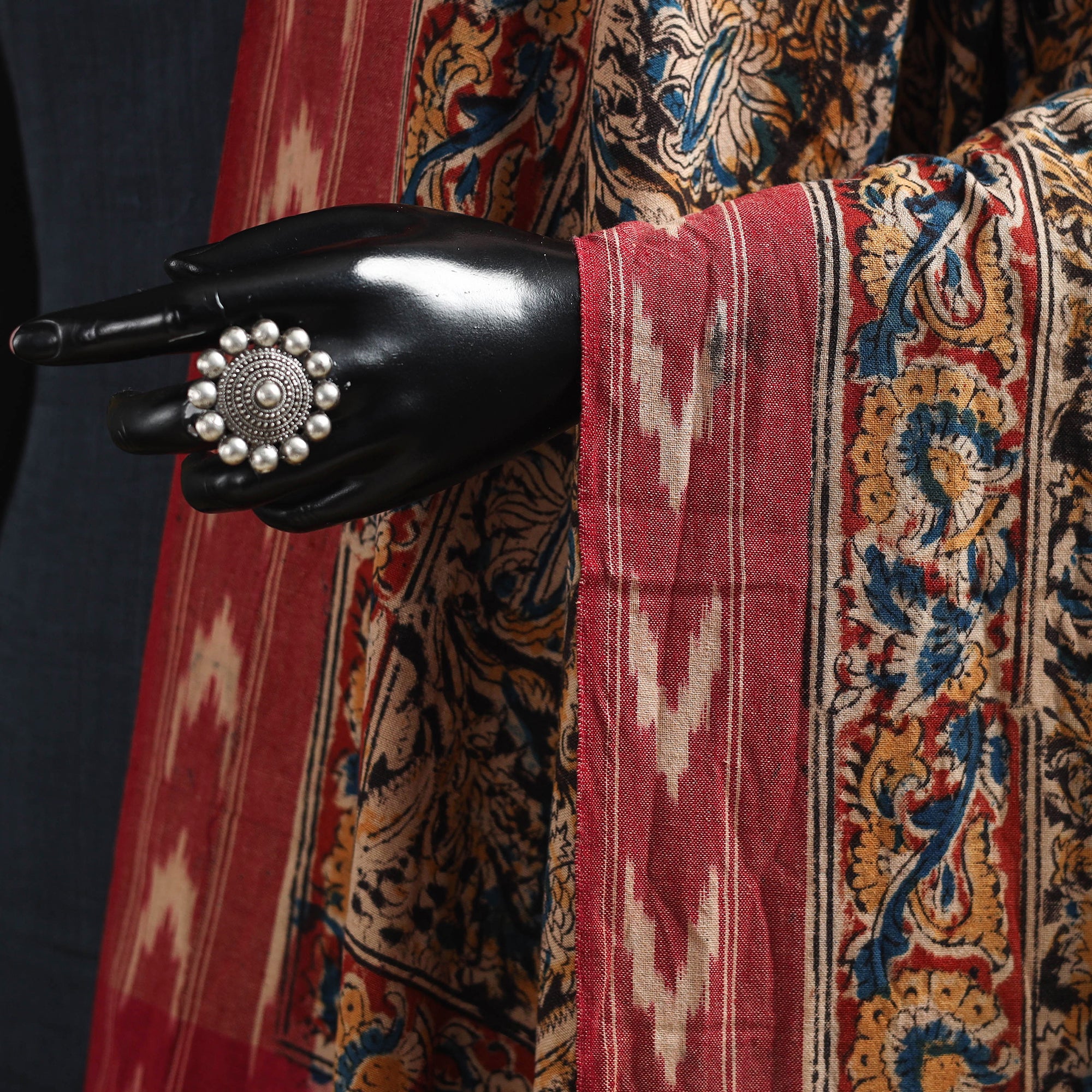 This multicolor naturally dyed kalamkari cotton dupatta with a pochampally Ikat border beautifully blends two traditional Indian art forms. The center showcases intricate kalamkari block prints, while the vibrant Ikat border adds a beautifull contrast. Finished with delicate tassels along the edges, it’s crafted from soft cotton, perfect for pairing with both ethnic and contemporary outfits.