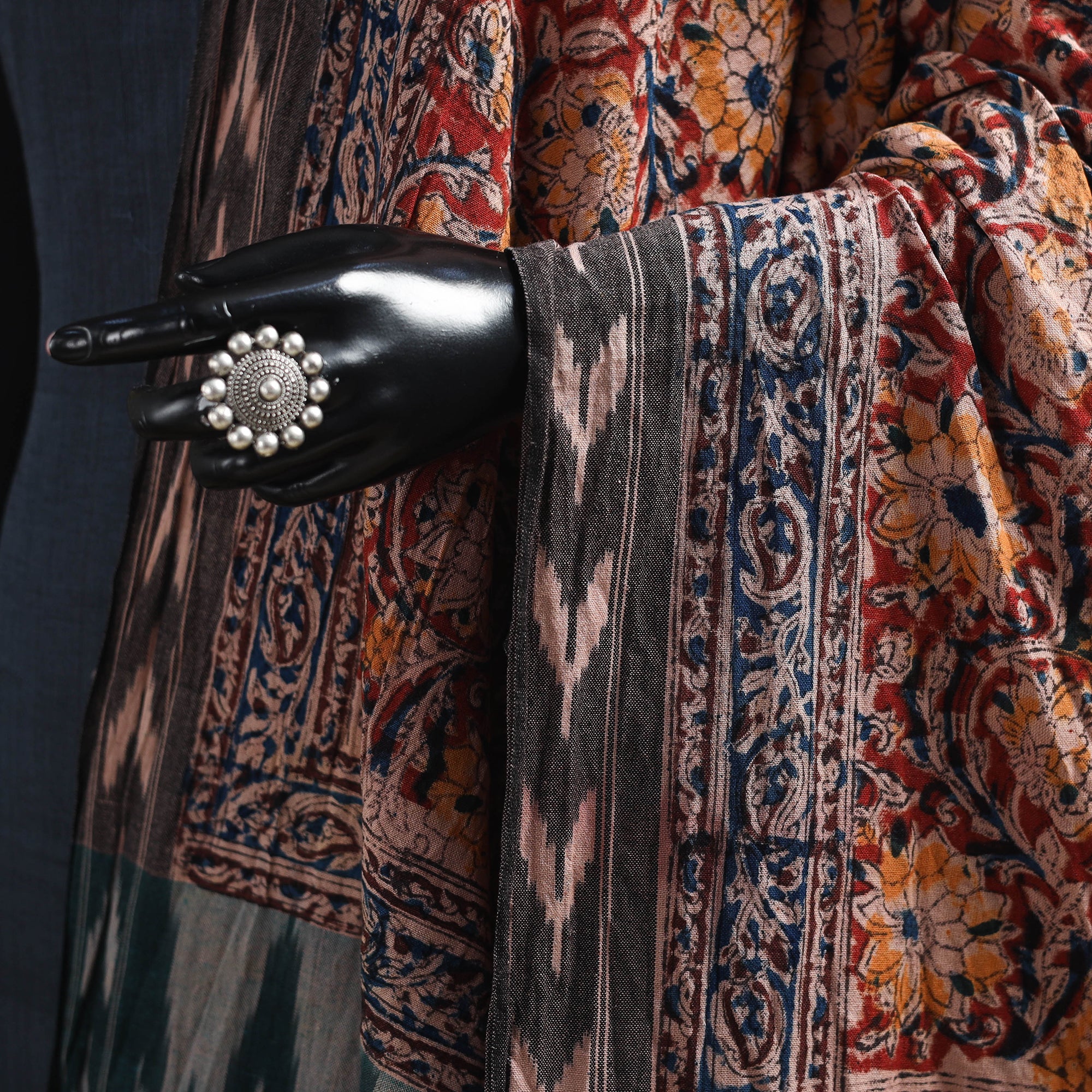 This multicolor naturally dyed kalamkari cotton dupatta with a pochampally Ikat border beautifully blends two traditional Indian art forms. The center showcases intricate kalamkari block prints, while the vibrant Ikat border adds a beautifull contrast. Finished with delicate tassels along the edges, it’s crafted from soft cotton, perfect for pairing with both ethnic and contemporary outfits.