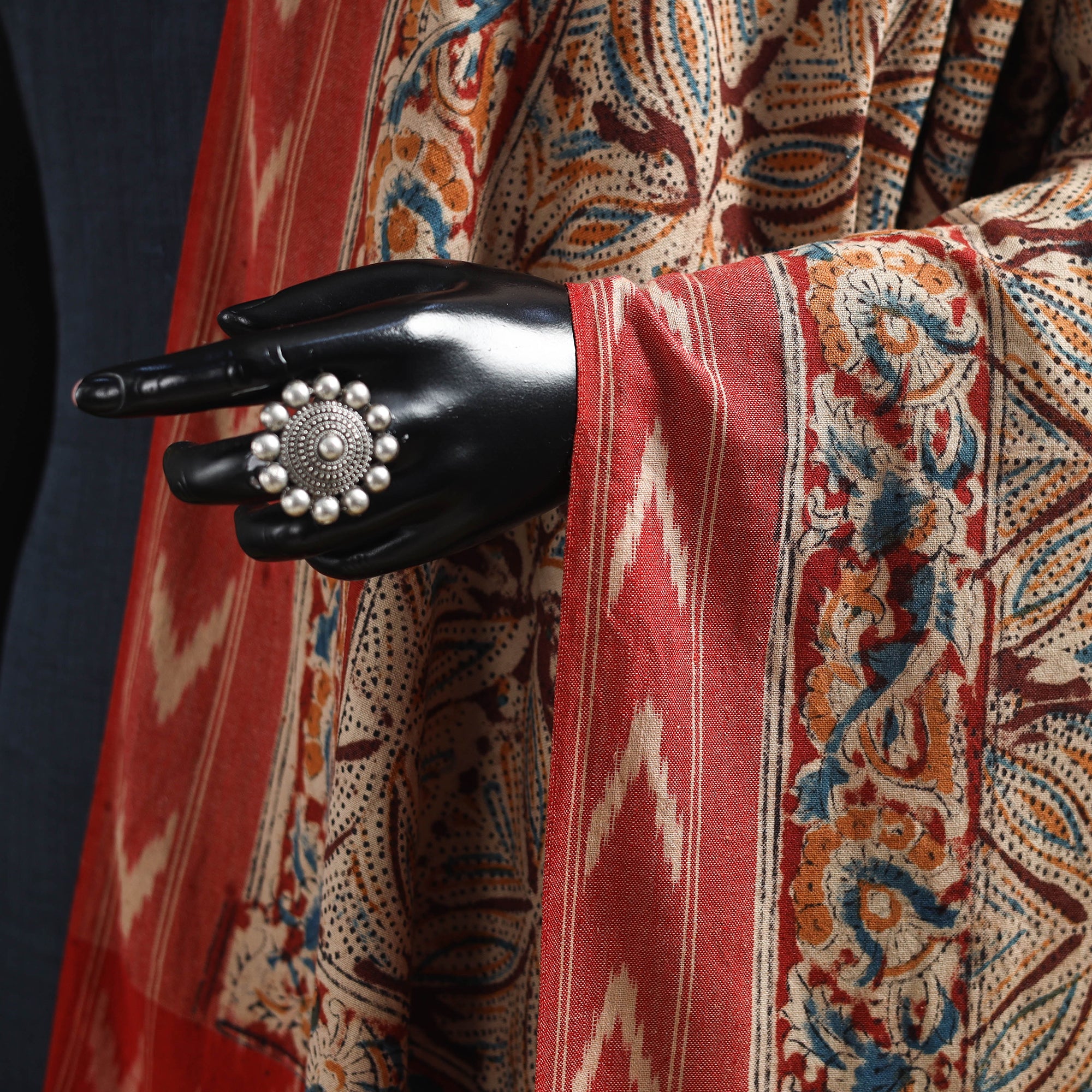 This multicolor naturally dyed kalamkari cotton dupatta with a pochampally Ikat border beautifully blends two traditional Indian art forms. The center showcases intricate kalamkari block prints, while the vibrant Ikat border adds a beautifull contrast. Finished with delicate tassels along the edges, it’s crafted from soft cotton, perfect for pairing with both ethnic and contemporary outfits.