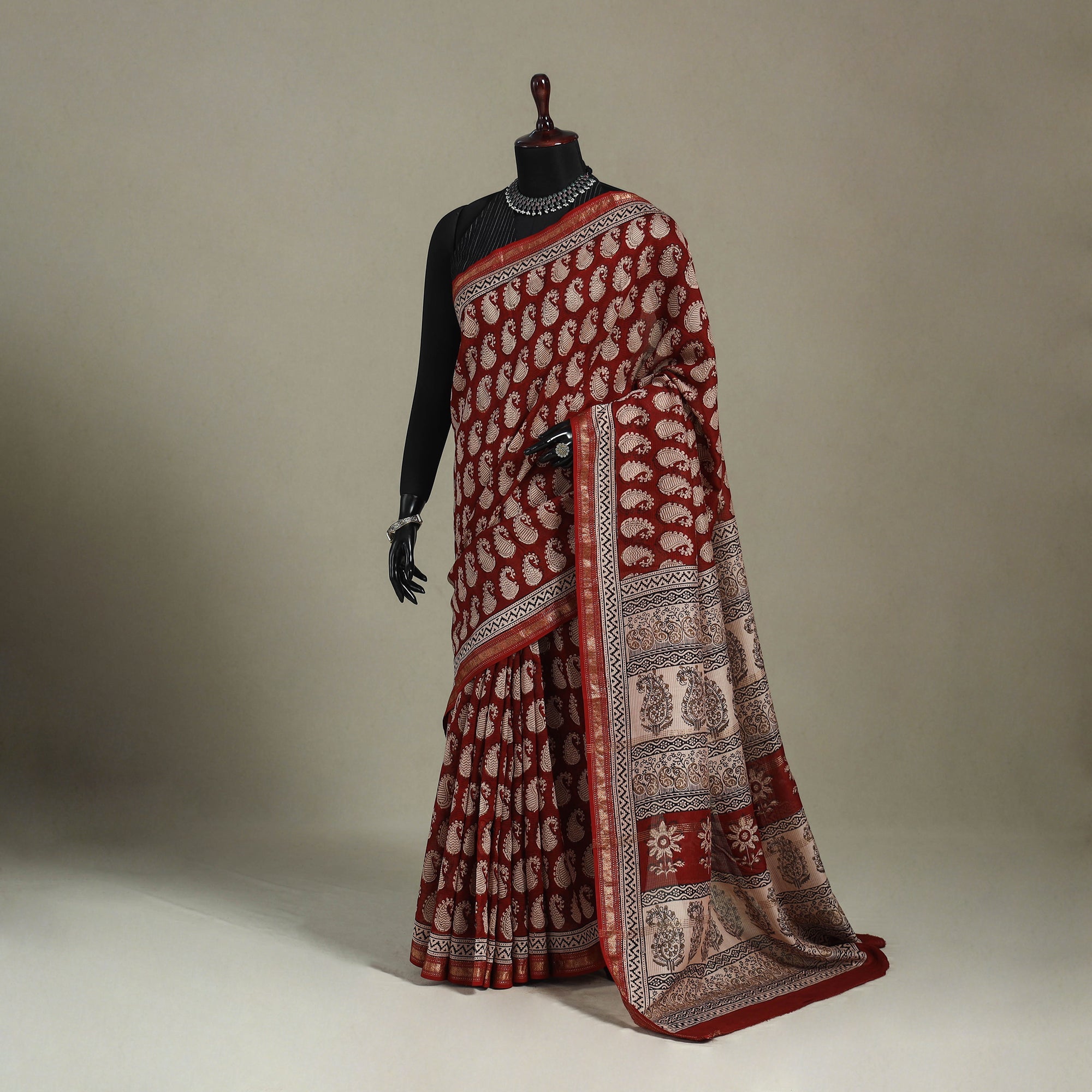 Experience the charm of this hand block-printed bagh maheshwari silk cotton saree, adorned with intricate patterns and rich colours made using natural dyes. Originating from the Bagh craft tradition of Dhar, Madhya Pradesh, it blends elegance with cultural heritage. Perfect for festive occasions, everyday wear, or as a thoughtful gift, this saree adds timeless grace and artisan touch to any wardrobe.