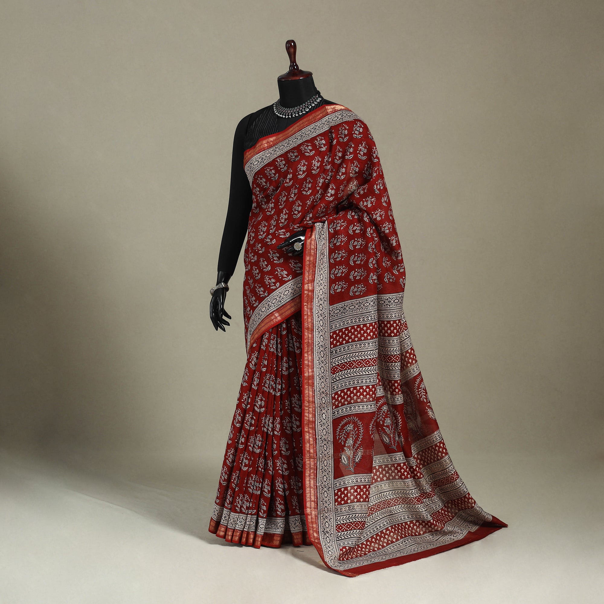 Experience the charm of this hand block-printed bagh maheshwari silk cotton saree, adorned with intricate patterns and rich colours made using natural dyes. Originating from the Bagh craft tradition of Dhar, Madhya Pradesh, it blends elegance with cultural heritage. Perfect for festive occasions, everyday wear, or as a thoughtful gift, this saree adds timeless grace and artisan touch to any wardrobe.