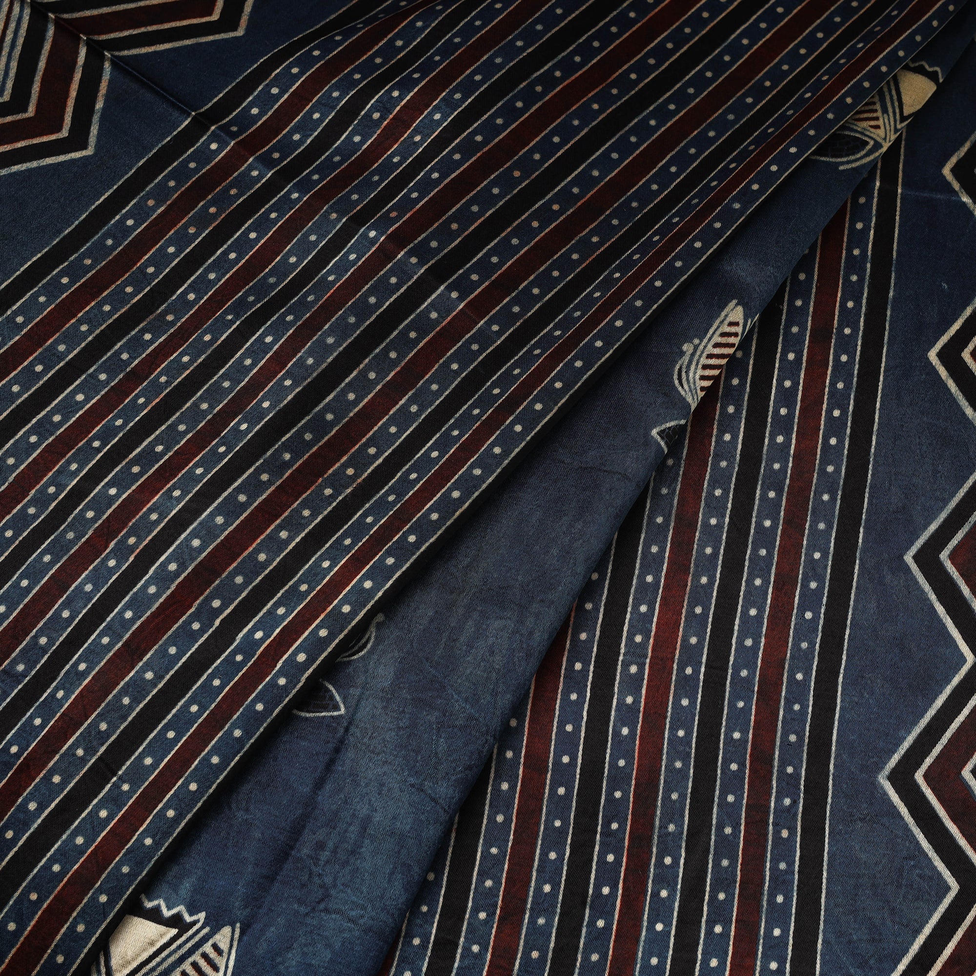 This blue mashru silk ajrakh fabric, hand block printed with natural dyes by skilled artisans of Kutch, blends the richness of silk with the comfort of cotton. Its soft sheen and intricate patterns make it ideal for garments, sarees, and traditional wear. Also perfect for accessories and home decor like cushions and drapes, this fabric brings a timeless touch of elegance and heritage to every creation.