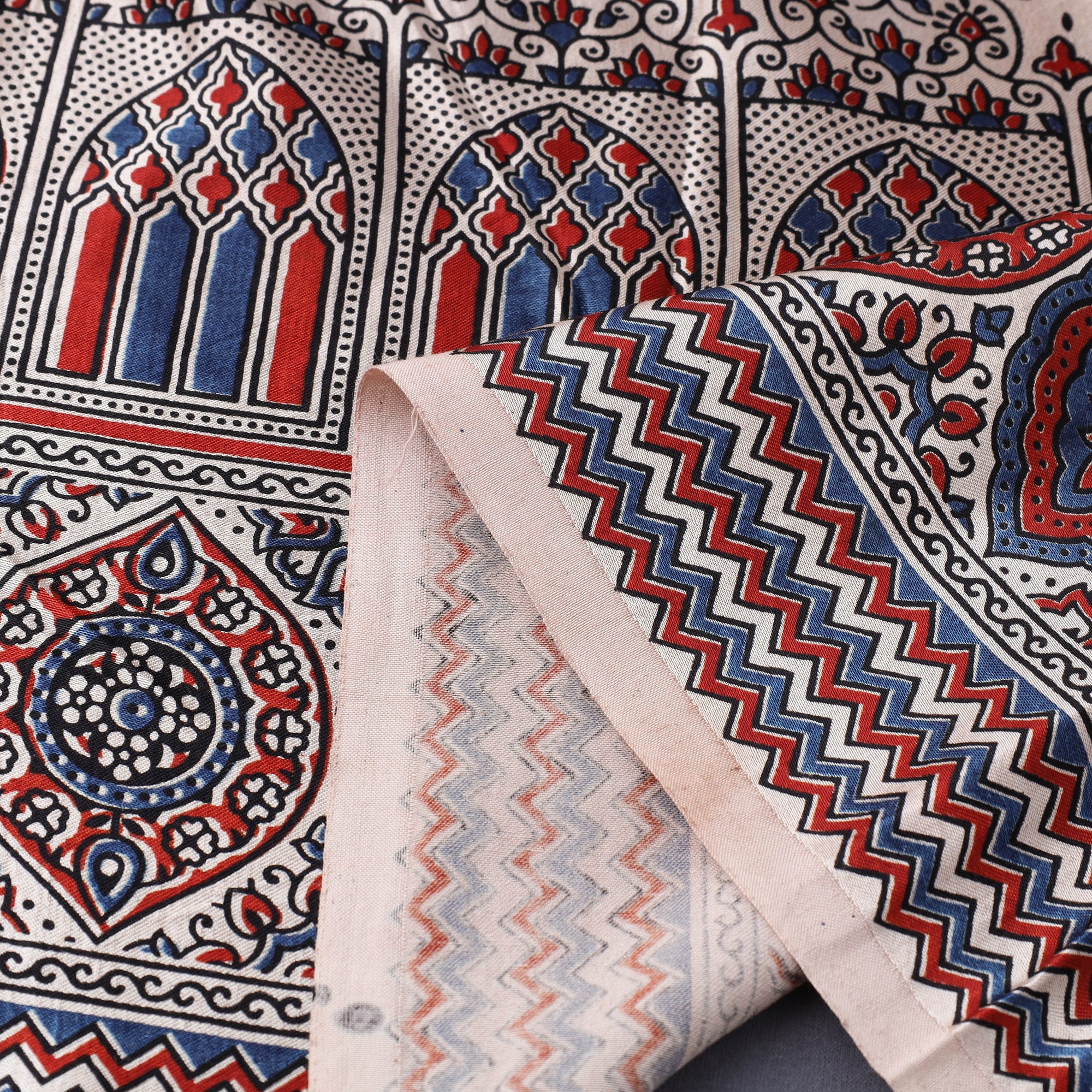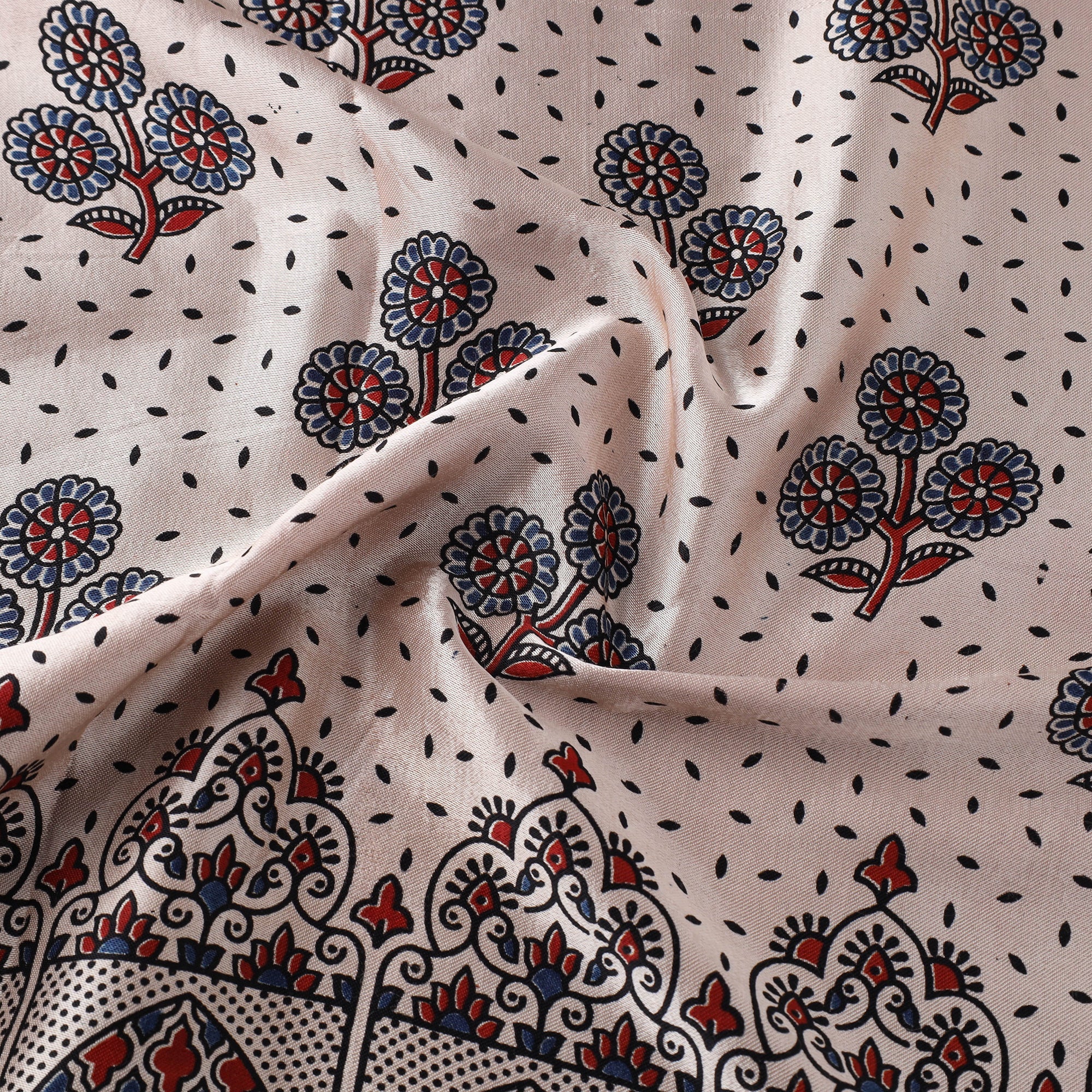 This beige mashru silk ajrakh fabric, hand block printed with natural dyes by skilled artisans of Kutch, blends the richness of silk with the comfort of cotton. Its soft sheen and intricate patterns make it ideal for garments, sarees, and traditional wear. Also perfect for accessories and home décor like cushions and drapes, this fabric brings a timeless touch of elegance and heritage to every creation.