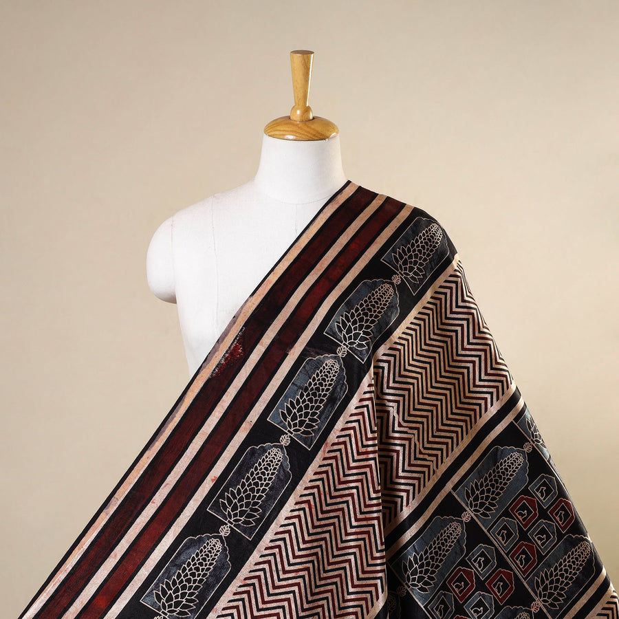 This brown mashru silk ajrakh fabric, hand block printed with natural dyes by skilled artisans of Kutch, blends the richness of silk with the comfort of cotton. Its soft sheen and intricate patterns make it ideal for garments, sarees, and traditional wear. Also perfect for accessories and home decor like cushions and drapes, this fabric brings a timeless touch of elegance and heritage to every creation.