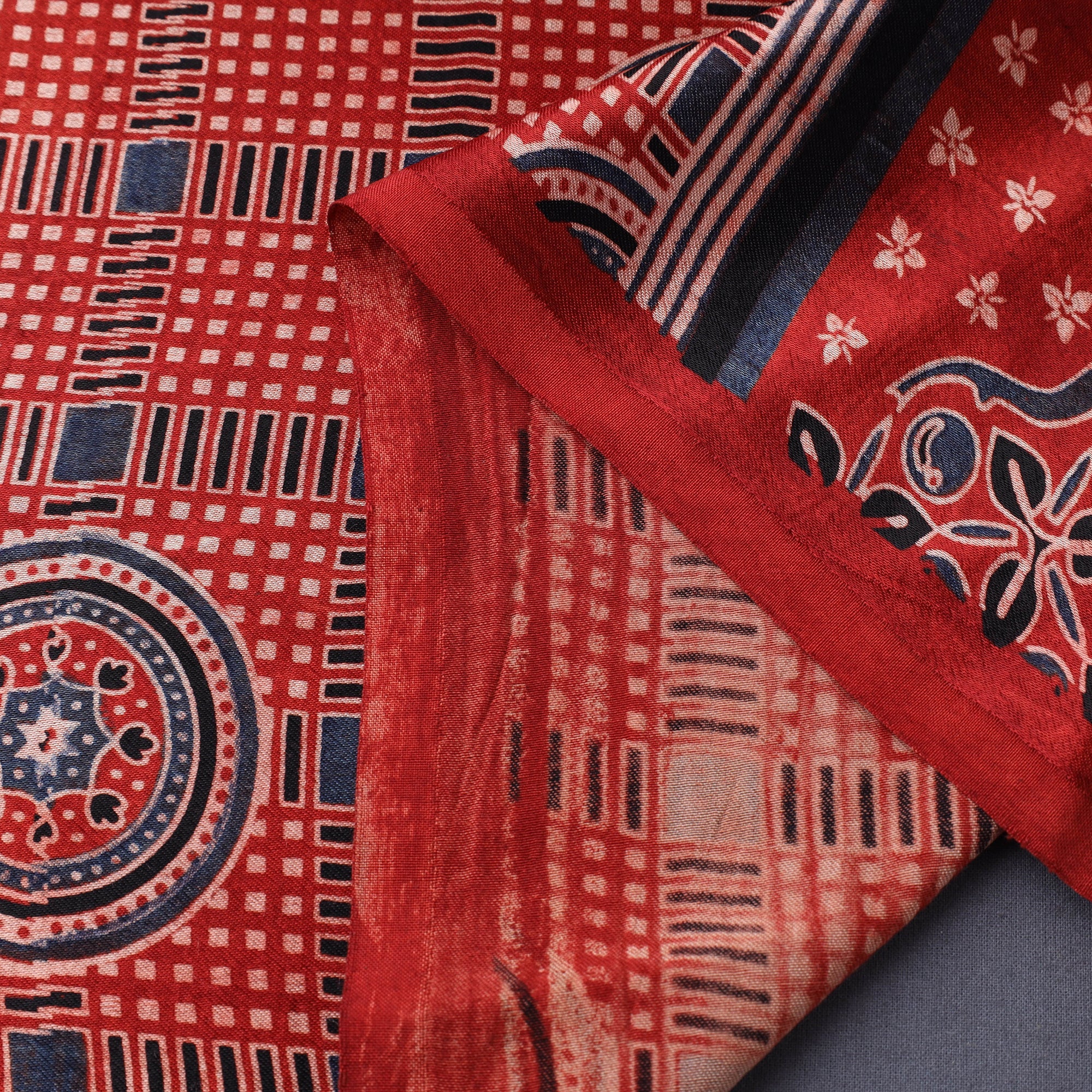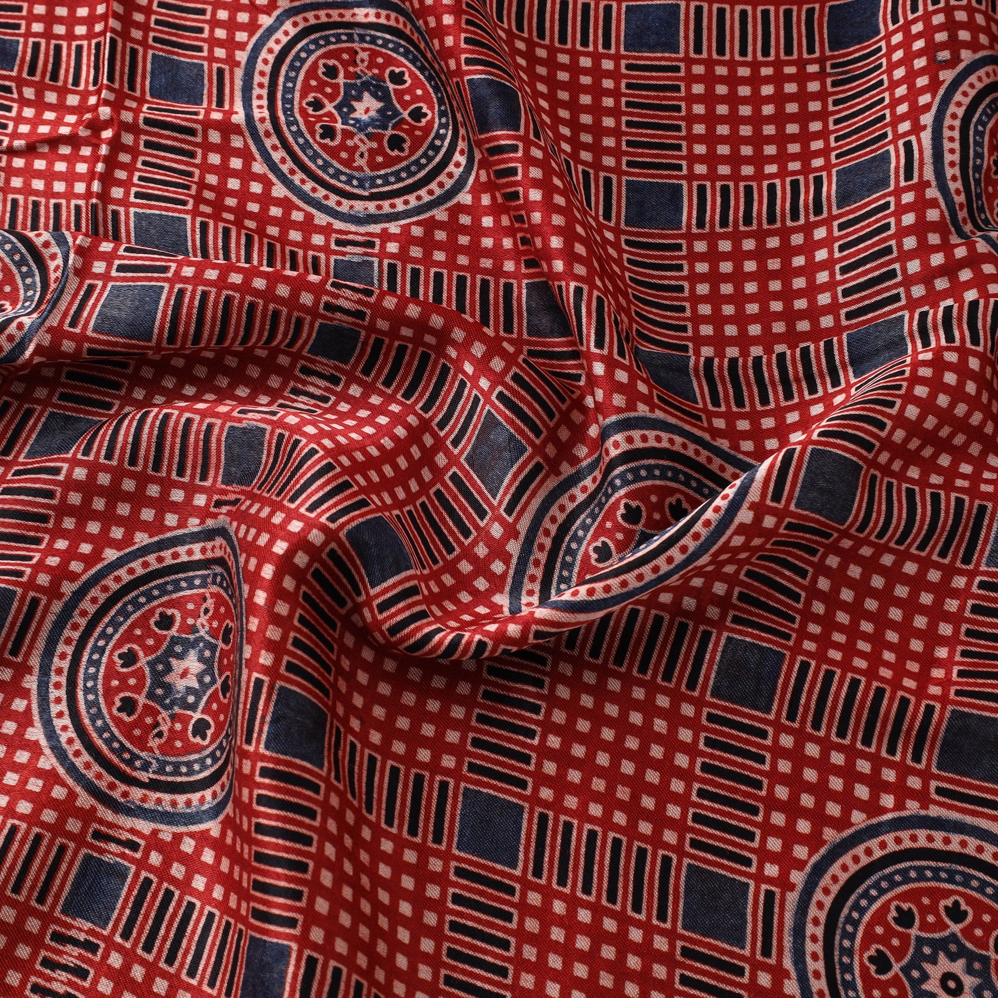 This red mashru silk ajrakh fabric, hand block printed with natural dyes by skilled artisans of Kutch, blends the richness of silk with the comfort of cotton. Its soft sheen and intricate patterns make it ideal for garments, sarees, and traditional wear. Also perfect for accessories and home décor like cushions and drapes, this fabric brings a timeless touch of elegance and heritage to every creation.