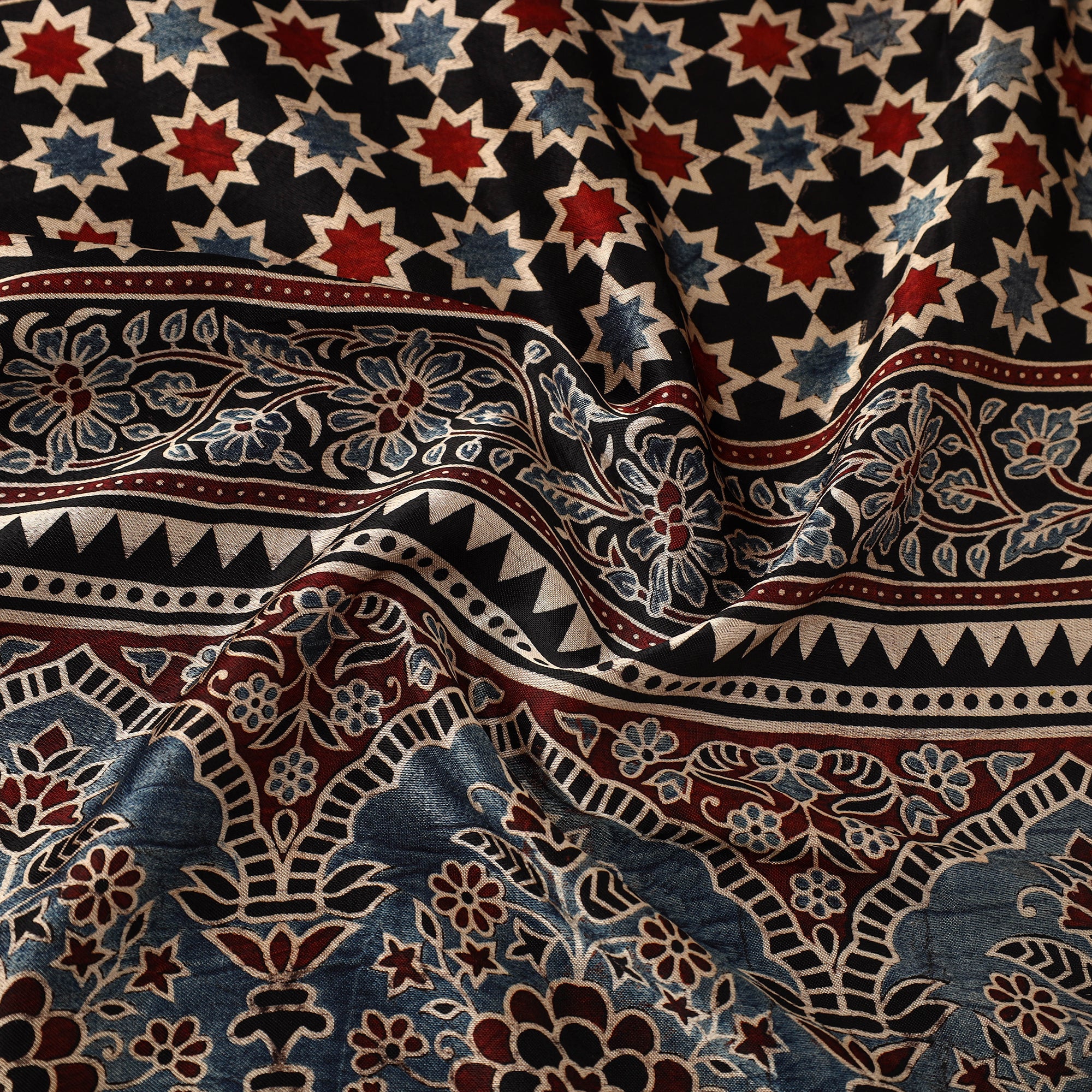 Ajrakh is a well-known traditional vegetable dyeing that resists block-printing techniques on cloth. Originated in Kutch, It is nearly around 4,500 years old practised by Khatri community of Kutch and Sikh.