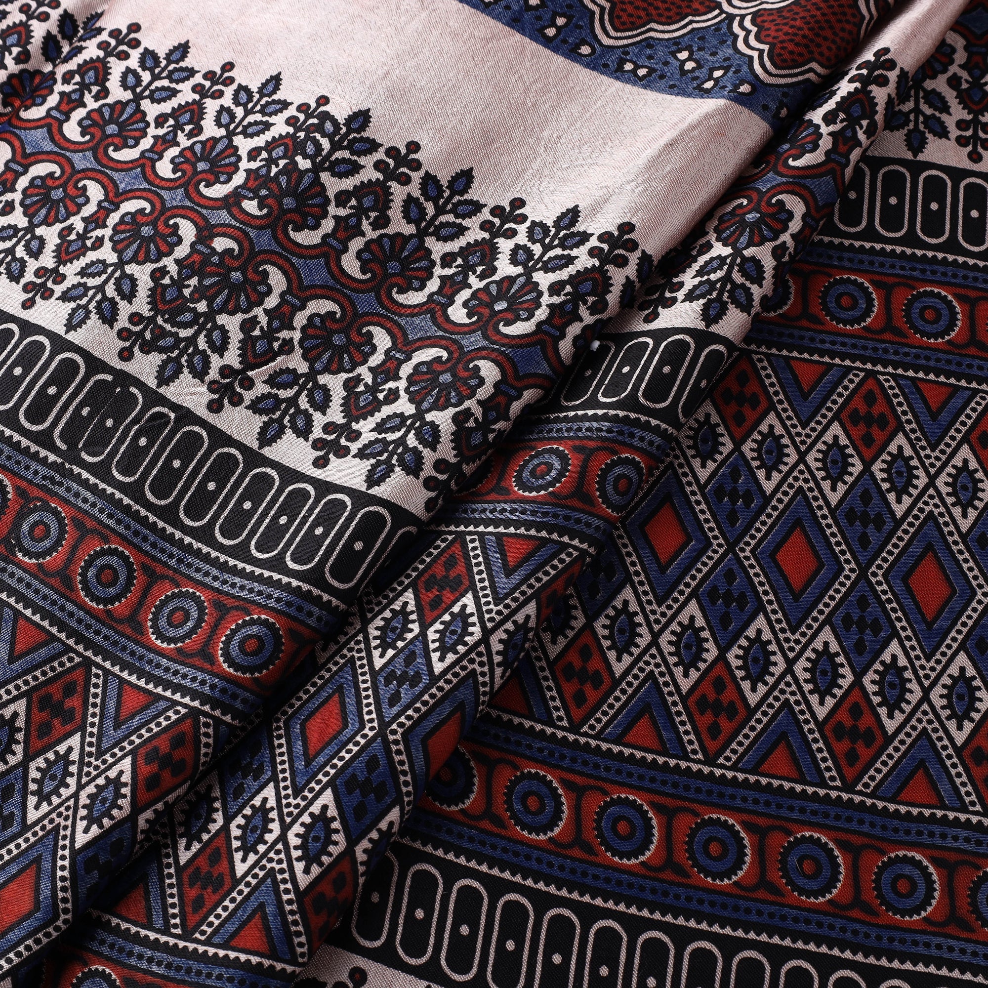 This beige mashru silk ajrakh fabric, hand block printed with natural dyes by skilled artisans of Kutch, blends the richness of silk with the comfort of cotton. Its soft sheen and intricate patterns make it ideal for garments, sarees, and traditional wear. Also perfect for accessories and home décor like cushions and drapes, this fabric brings a timeless touch of elegance and heritage to every creation.