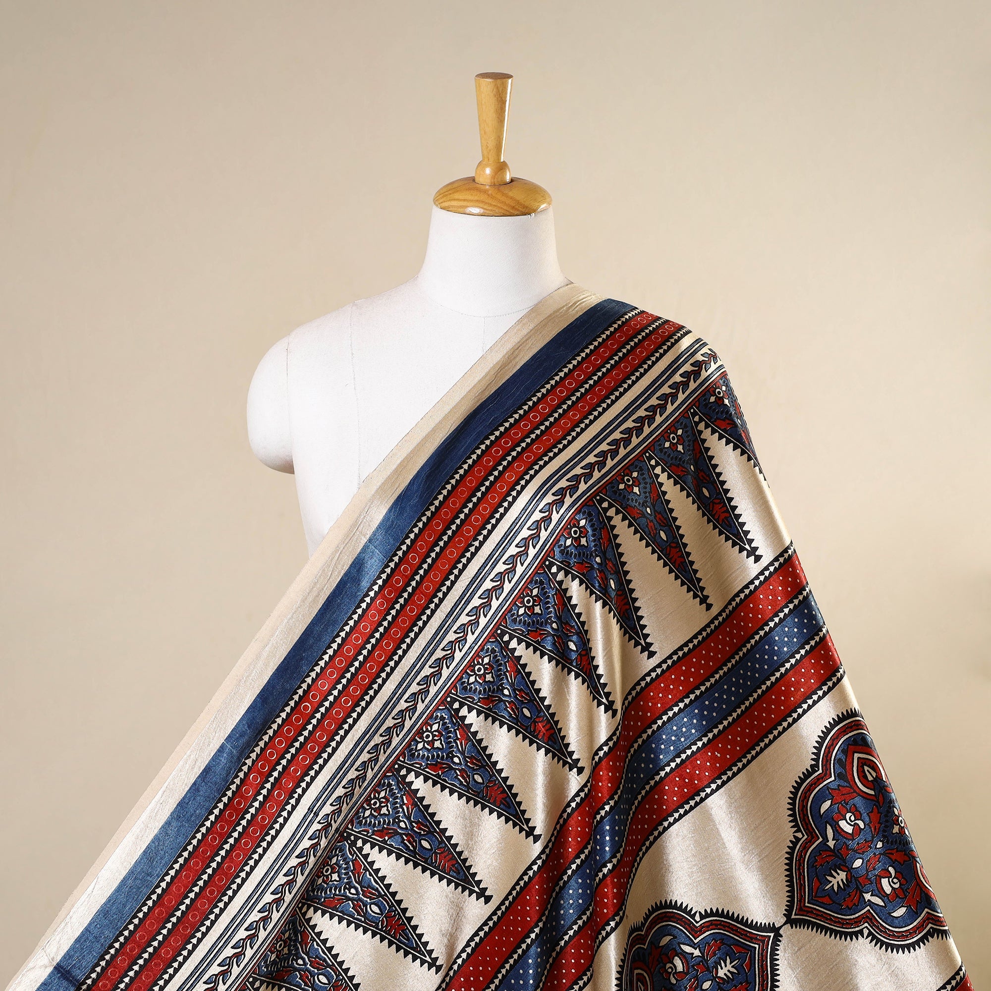 This beige mashru silk ajrakh fabric, hand block printed with natural dyes by skilled artisans of Kutch, blends the richness of silk with the comfort of cotton. Its soft sheen and intricate patterns make it ideal for garments, sarees, and traditional wear. Also perfect for accessories and home decor like cushions and drapes, this fabric brings a timeless touch of elegance and heritage to every creation.