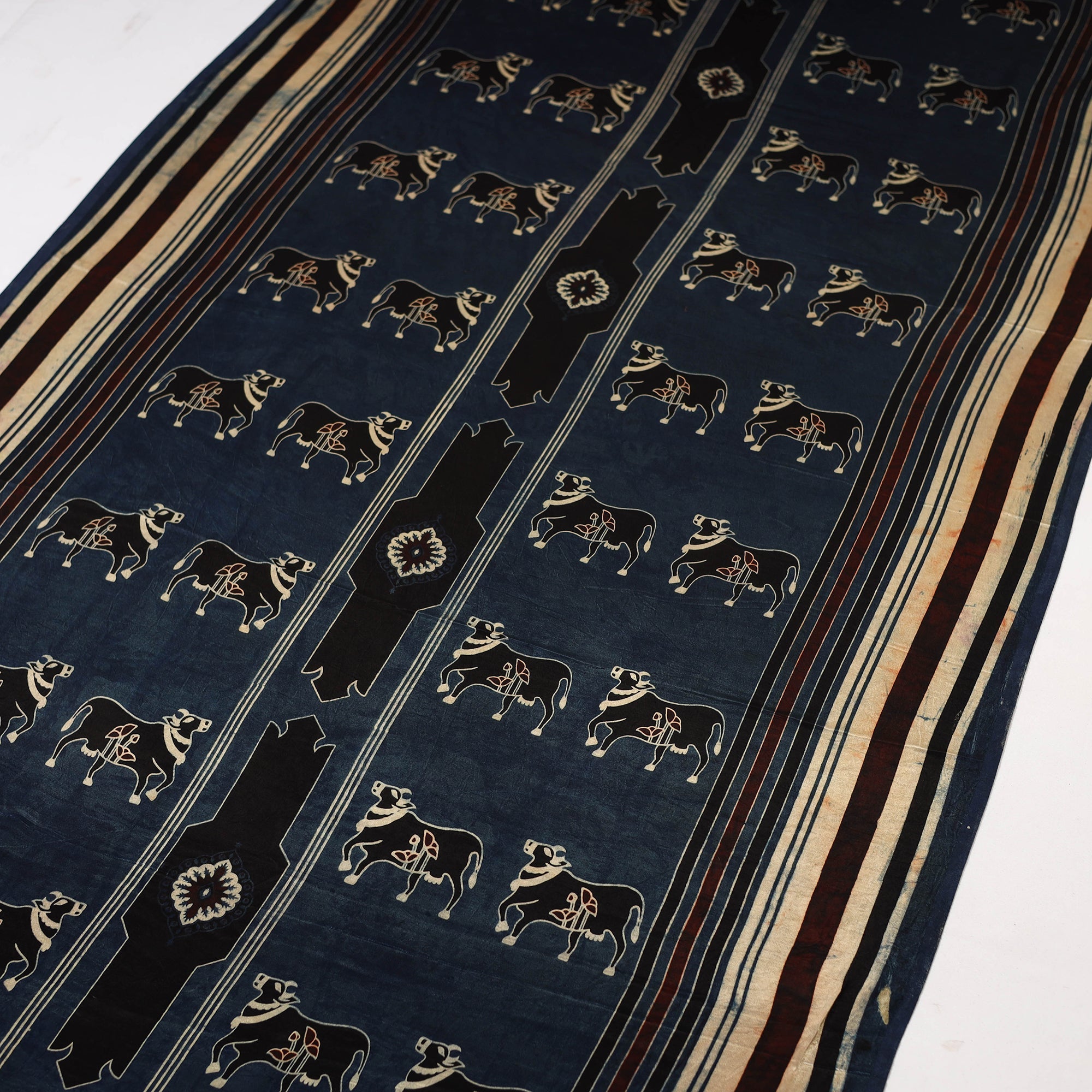 This blue mashru silk ajrakh fabric, hand block printed with natural dyes by skilled artisans of Kutch, blends the richness of silk with the comfort of cotton. Its soft sheen and intricate patterns make it ideal for garments, sarees, and traditional wear. Also perfect for accessories and home decor like cushions and drapes, this fabric brings a timeless touch of elegance and heritage to every creation.