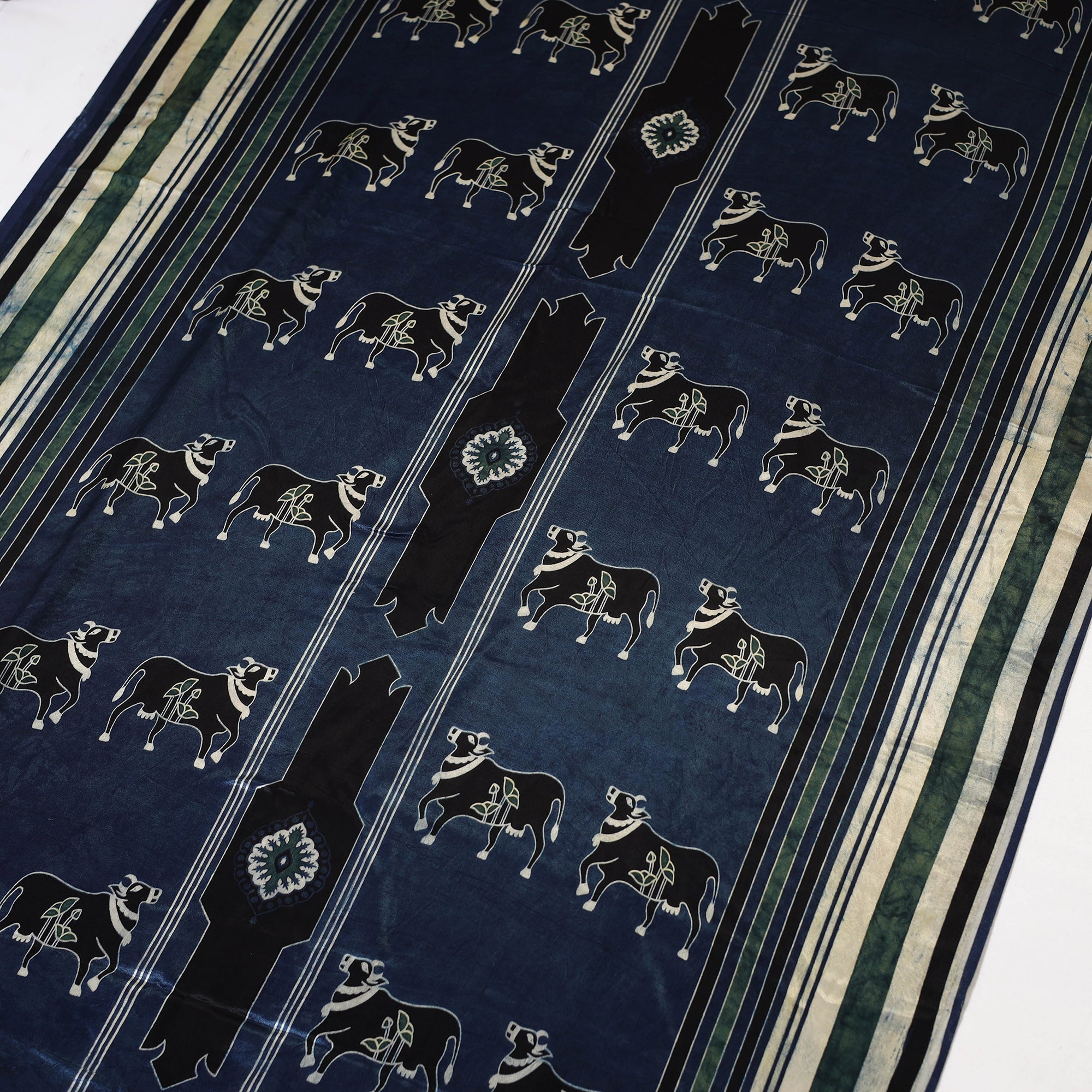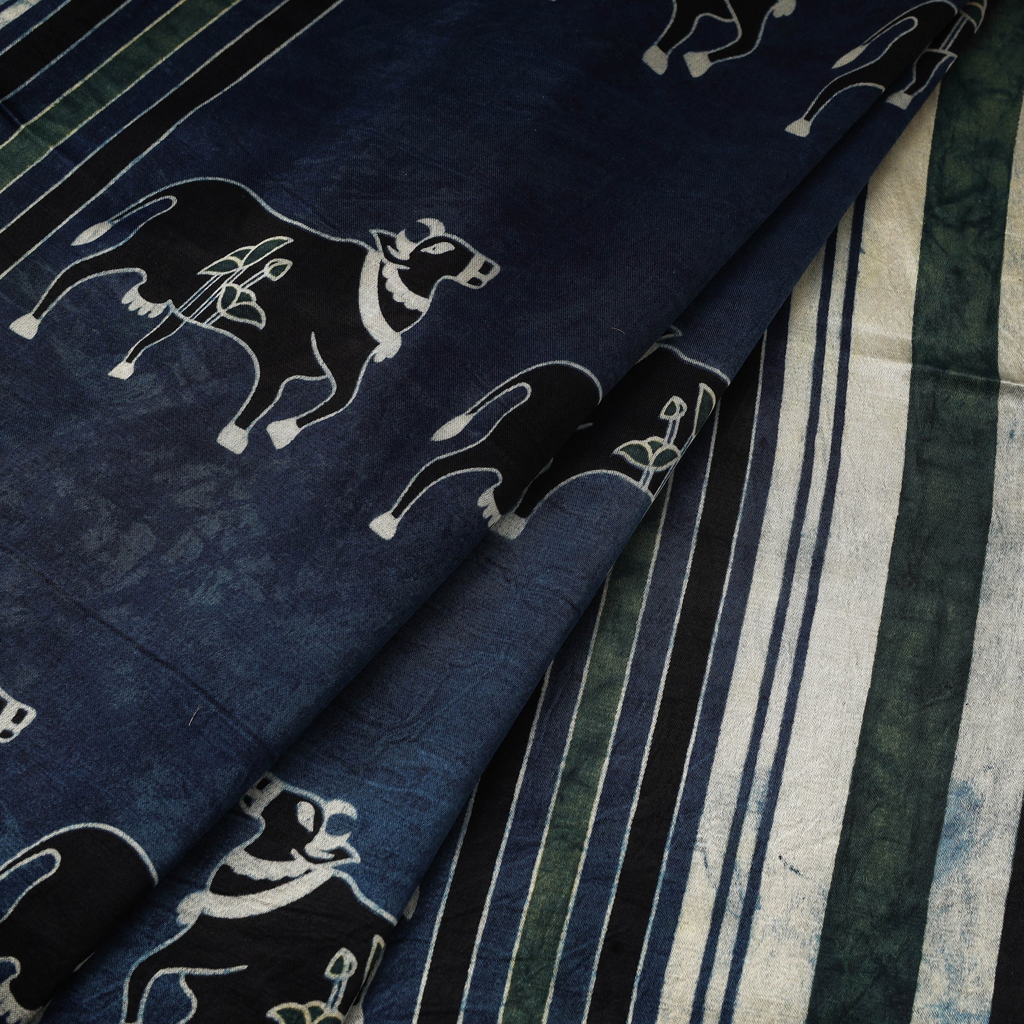 This blue mashru silk ajrakh fabric, hand block printed with natural dyes by skilled artisans of Kutch, blends the richness of silk with the comfort of cotton. Its soft sheen and intricate patterns make it ideal for garments, sarees, and traditional wear. Also perfect for accessories and home decor like cushions and drapes, this fabric brings a timeless touch of elegance and heritage to every creation.