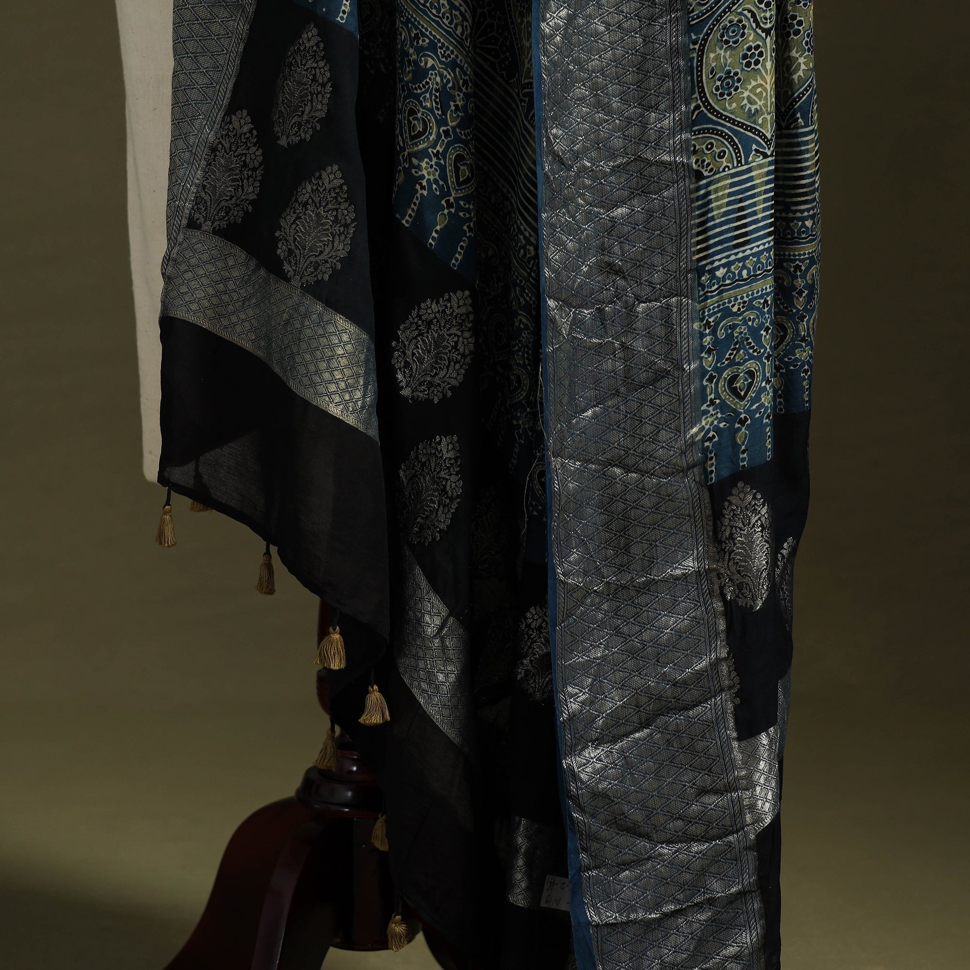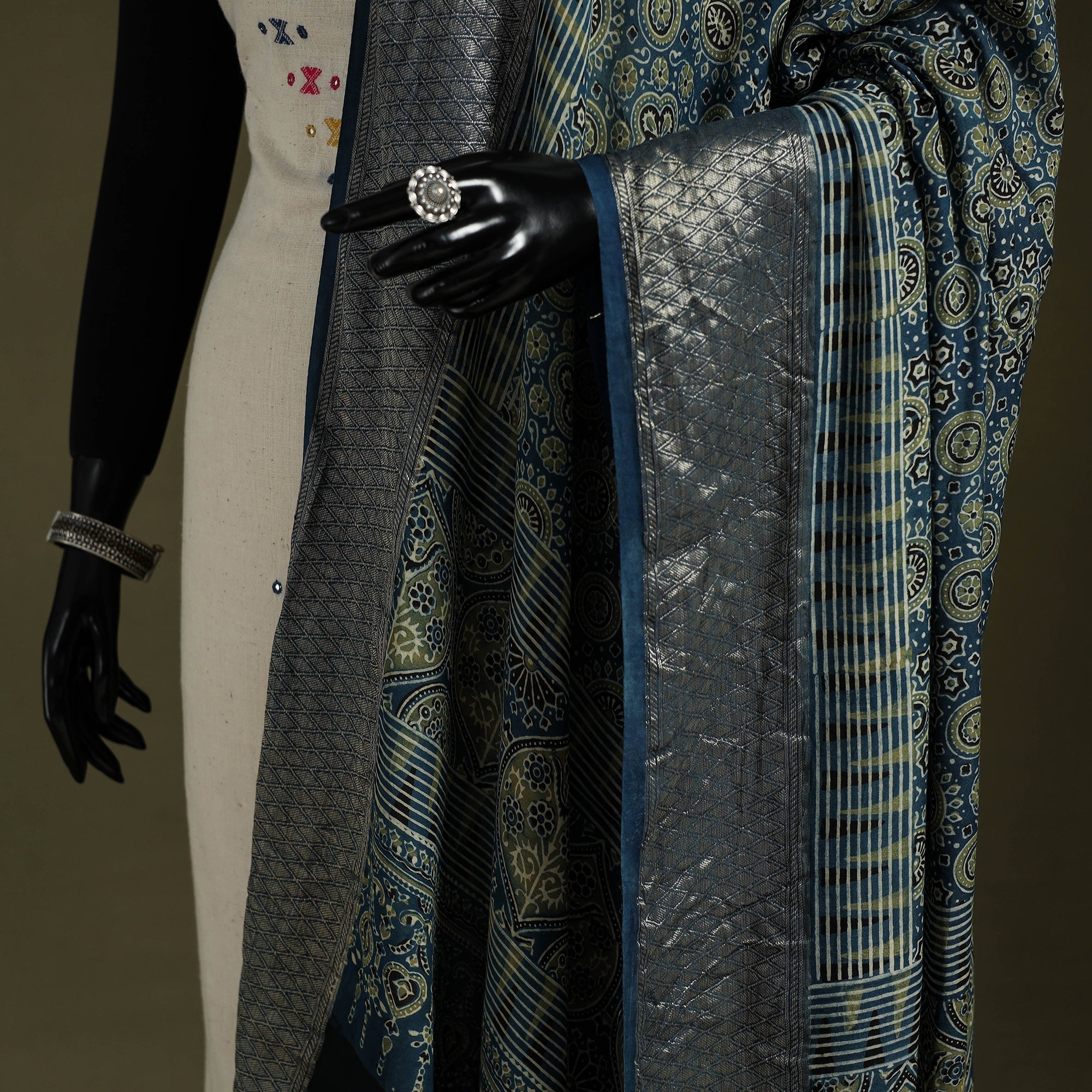 Elevate your wardrobe with this blue ajrakh modal silk dupatta, adorned with a zari border and tassels. Naturally dyed and hand-block printed in Kutch, Gujarat, by artisan Riyaz Abdulmajid Khatri, it reflects the richness of Ajrakh craft, celebrated for its intricate geometric patterns. The smooth modal silk lends a graceful drape, ideal for festive gatherings or elegant day outings.