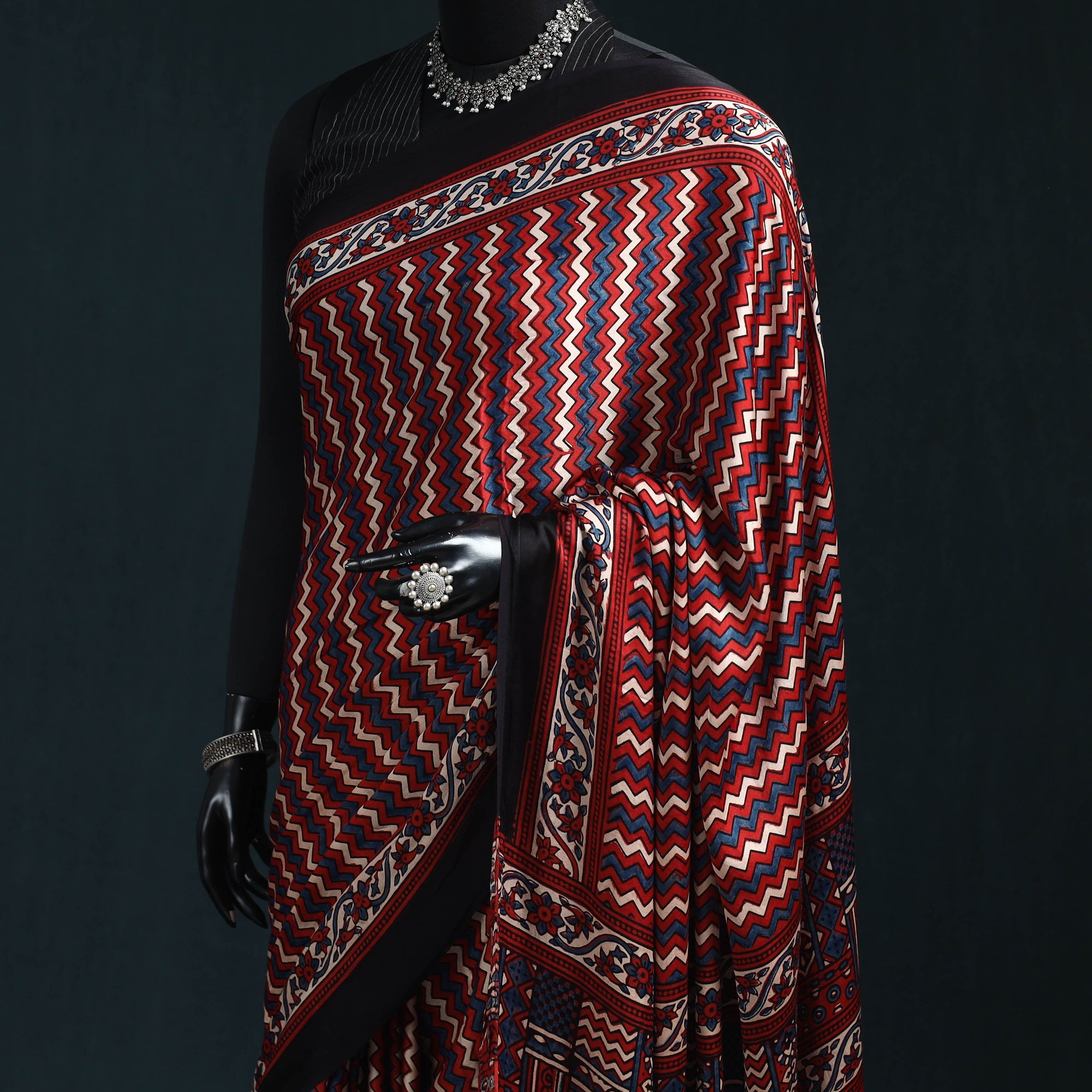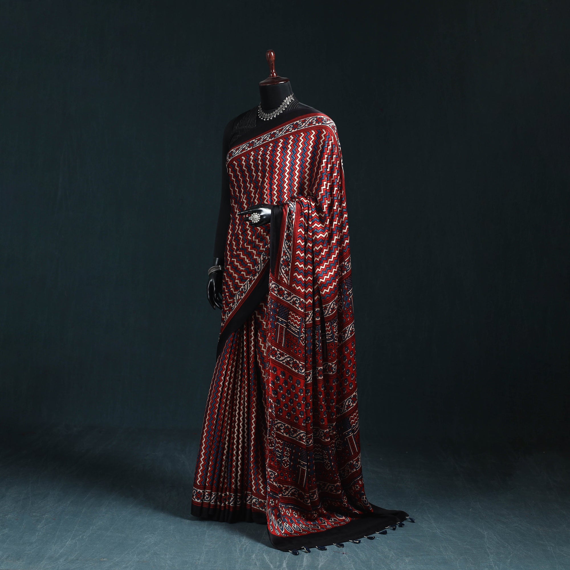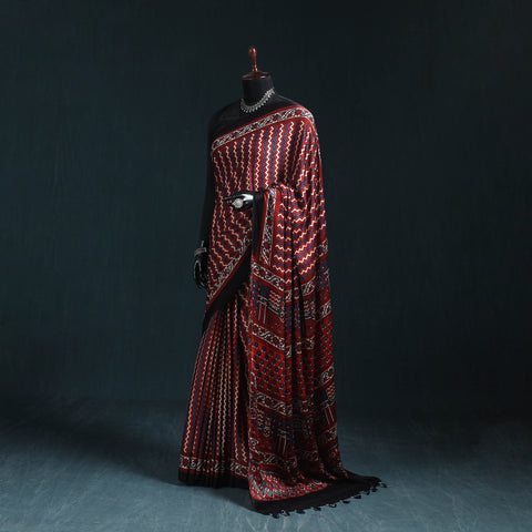 | Material | Traditional red ajrakh saree is hand block printed by skilled artisans from Kutch. This saree is crafted using natural dyes and follows the time-honoured Ajrakh printing technique that originated in Kutch, Gujarat. With a history spanning over 4,500 years, Ajrakh reflects India’s rich cultural heritage. Made from modal silk, the saree is elegantly finished with delicate tassels that add a graceful touch. It is perfect for occasions, cultural gatherings and elegant everyday wear. A Note on Handmade Beauty |