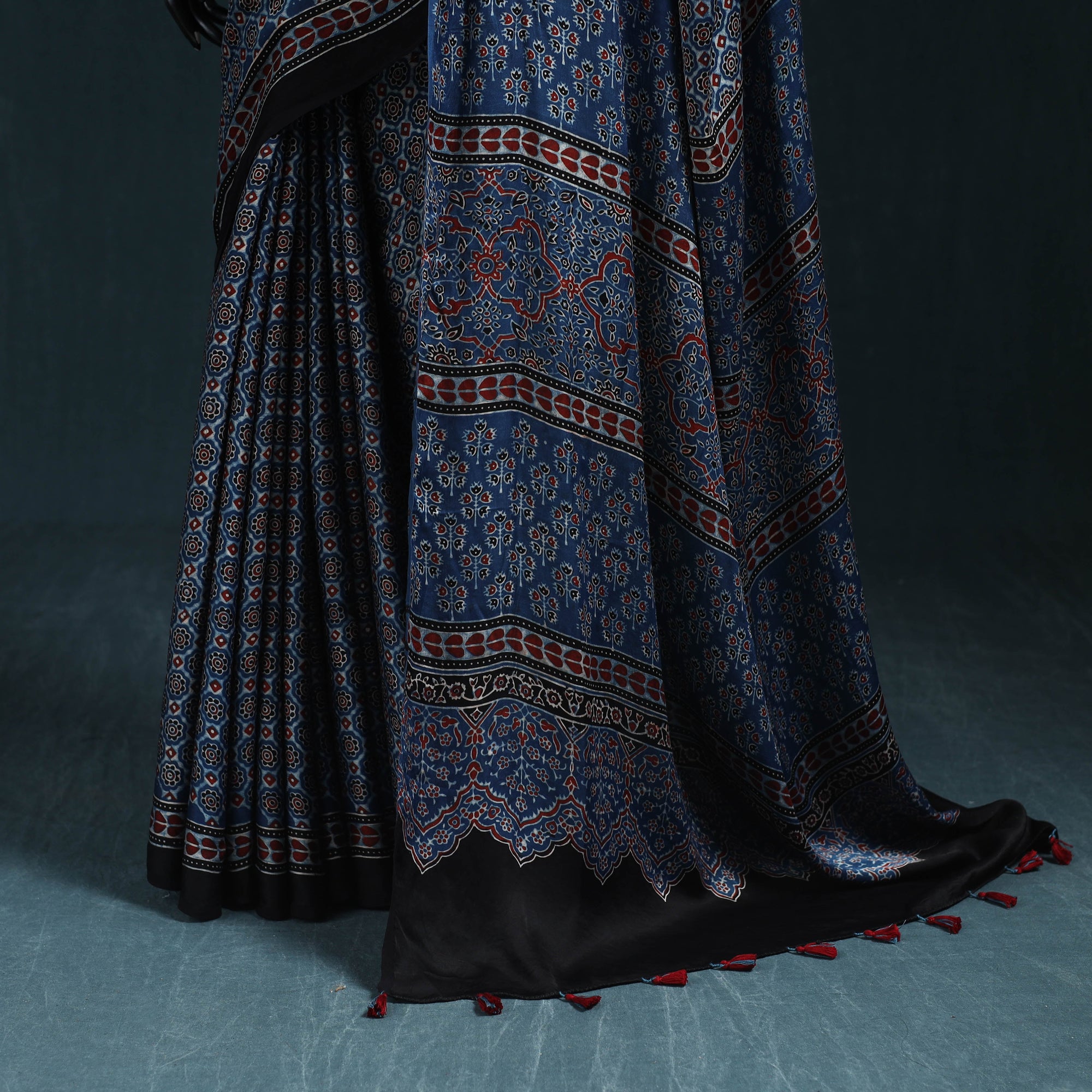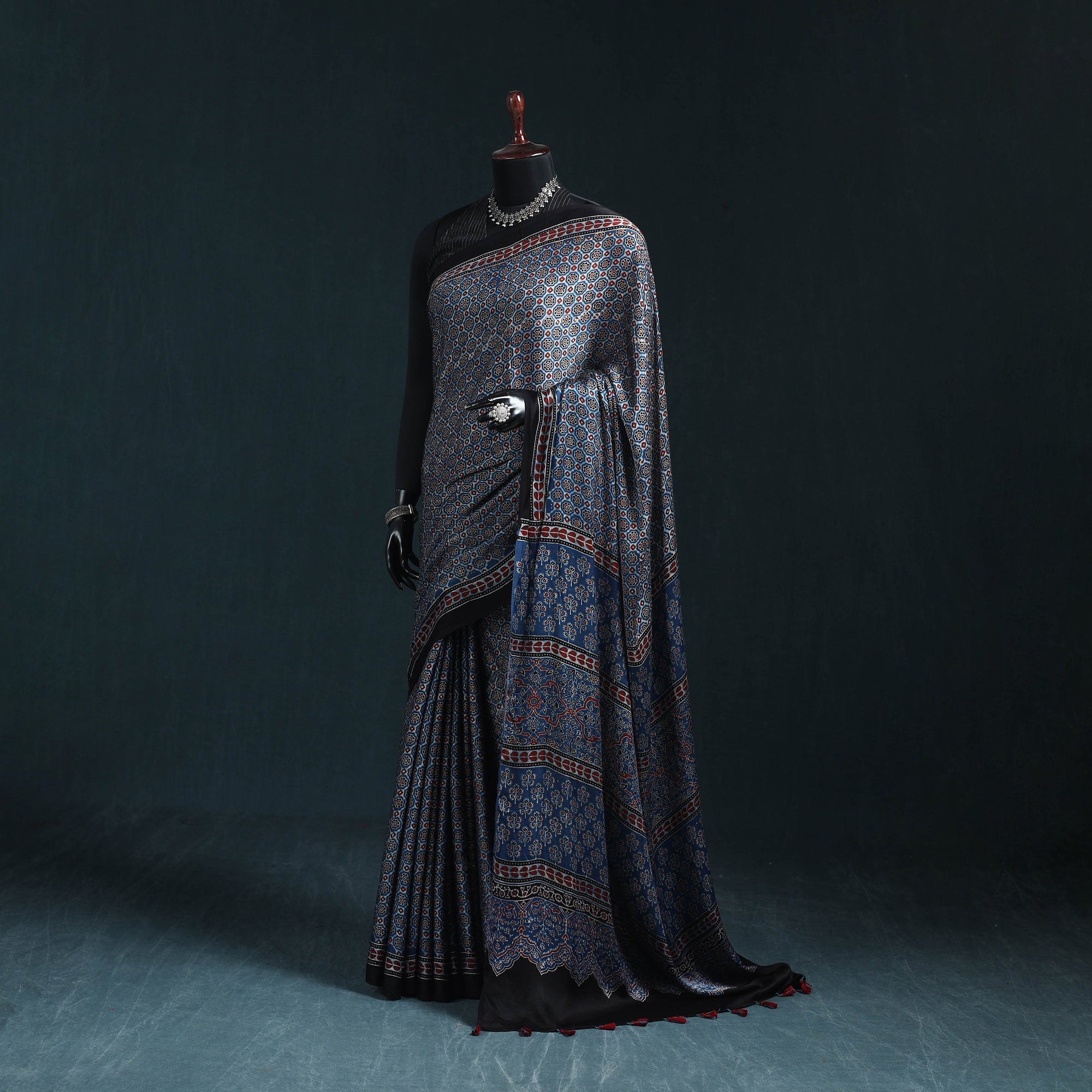 Traditional ajrakh saree is hand block printed by skilled artisans from Kutch. This saree is crafted using natural dyes and follows the time-honoured Ajrakh printing technique that originated in Kutch, Gujarat. With a history spanning over 4,500 years, Ajrakh reflects India’s rich cultural heritage. Made from modal silk, the saree is elegantly finished with delicate tassels that add a graceful touch. It is perfect for occasions, cultural gatherings and elegant everyday wear.