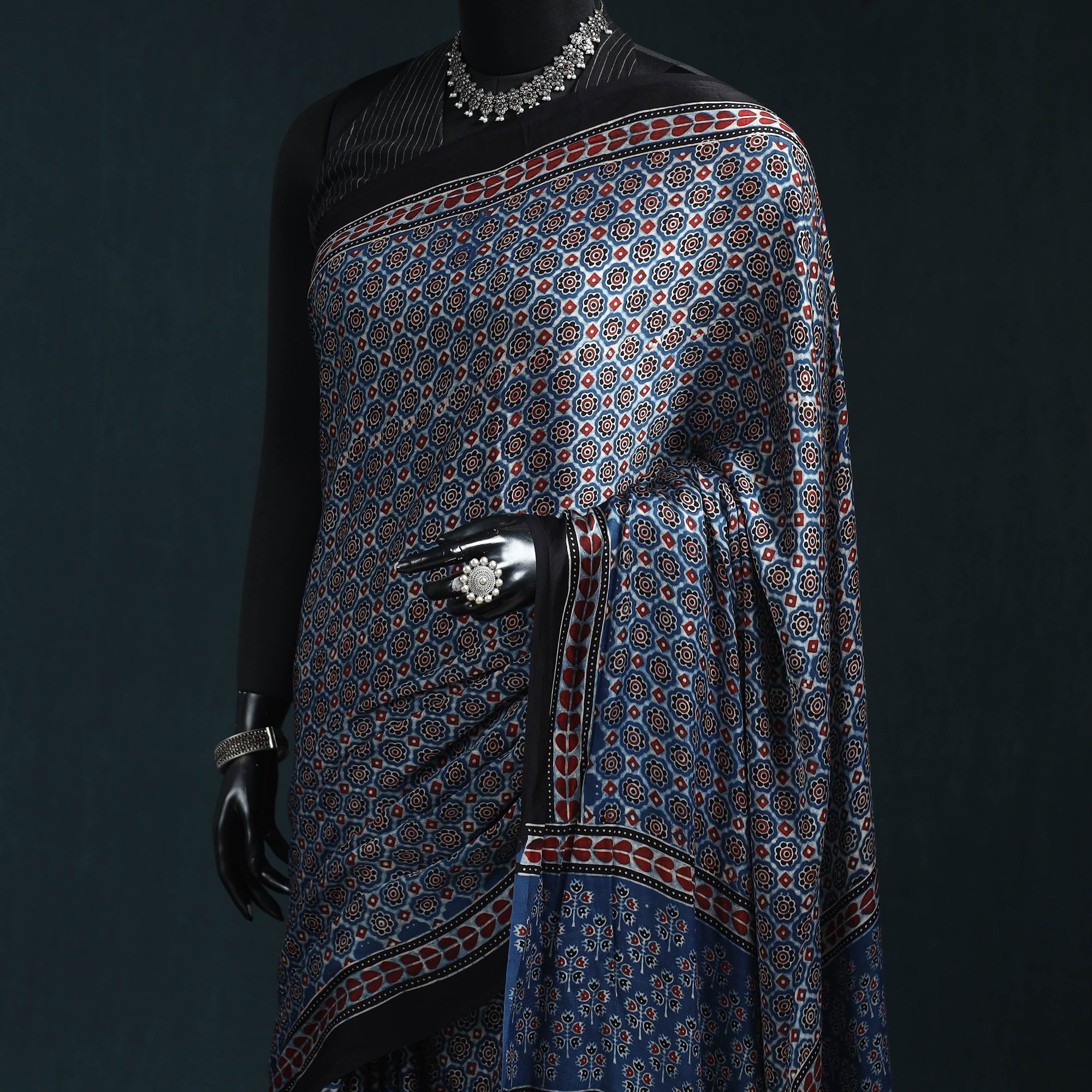 • Natural dyed modal silk kutch hand block print ajrakh saree