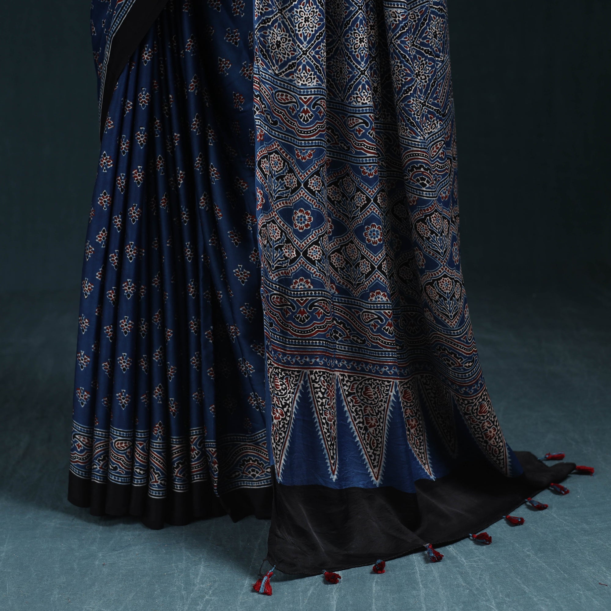 Natural Dyed Modal Silk Kutch Hand Block Print Ajrakh Saree 31