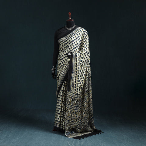 Traditional ajrakh saree is hand block printed by skilled artisans from Kutch. This saree is crafted using natural dyes and follows the time-honoured Ajrakh printing technique that originated in Kutch, Gujarat. With a history spanning over 4,500 years, Ajrakh reflects India’s rich cultural heritage. Made from modal silk, the saree is elegantly finished with delicate tassels that add a graceful touch. It is perfect for occasions, cultural gatherings and elegant everyday wear.