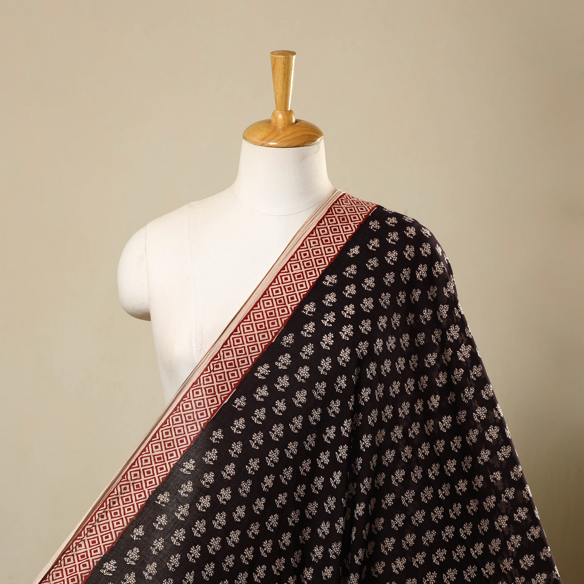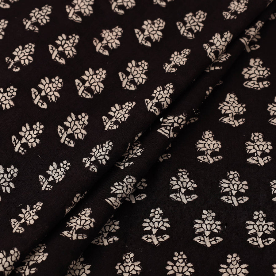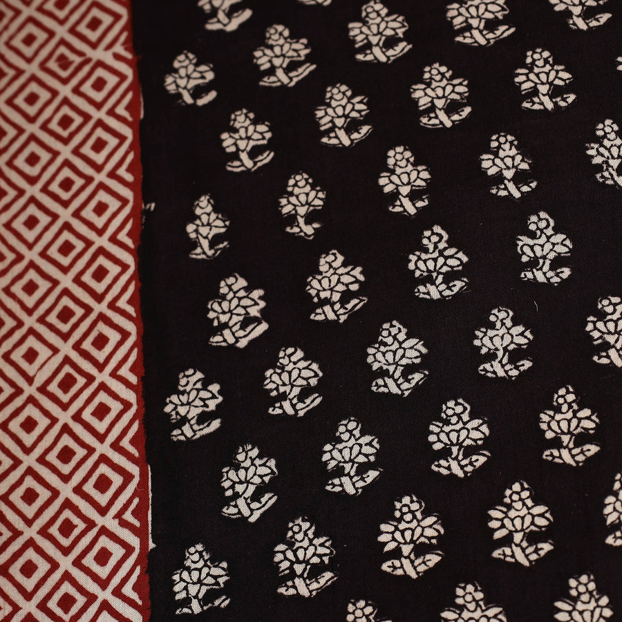 Experience the timeless artistry of black bagh printing with this exquisite fabric, skillfully hand block printed by master artisan Umar Faruk Khatri from Bagh, Madhya Pradesh. Made from soft mul cotton and adorned with natural dyes, it features a mesmerizing blend of floral and geometric patterns. Its airy and lightweight texture makes it an excellent choice for both traditional and modern fashion styles.