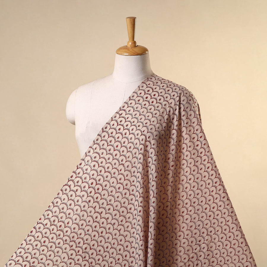 Exquisite is the artistry of beige Bagh fabric, hand block-printed by master artisan Bilal Khatri from Madhya Pradesh. Made from mul cotton and dyed with natural colors, it features a mesmerizing blend of floral and geometric patterns. Its airy, lightweight texture makes it an excellent choice for both traditional and modern fashion styles.