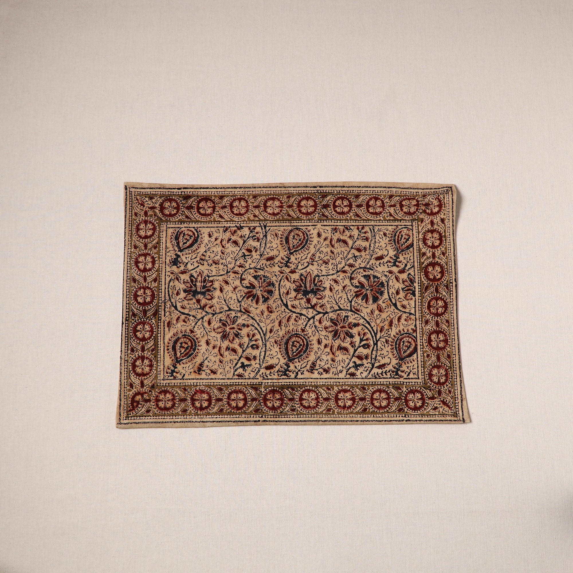 Fine-quality beige kalamkari block-printed, naturally dyed cotton table mat skillfully crafted by the artisans of Pedana. It features an assortment of hand block motifs inspired by traditional Kalamkari art. Perfect for dining tables or as decorative accents, this mat protects surfaces and adds a touch of artisanal charm to your home.