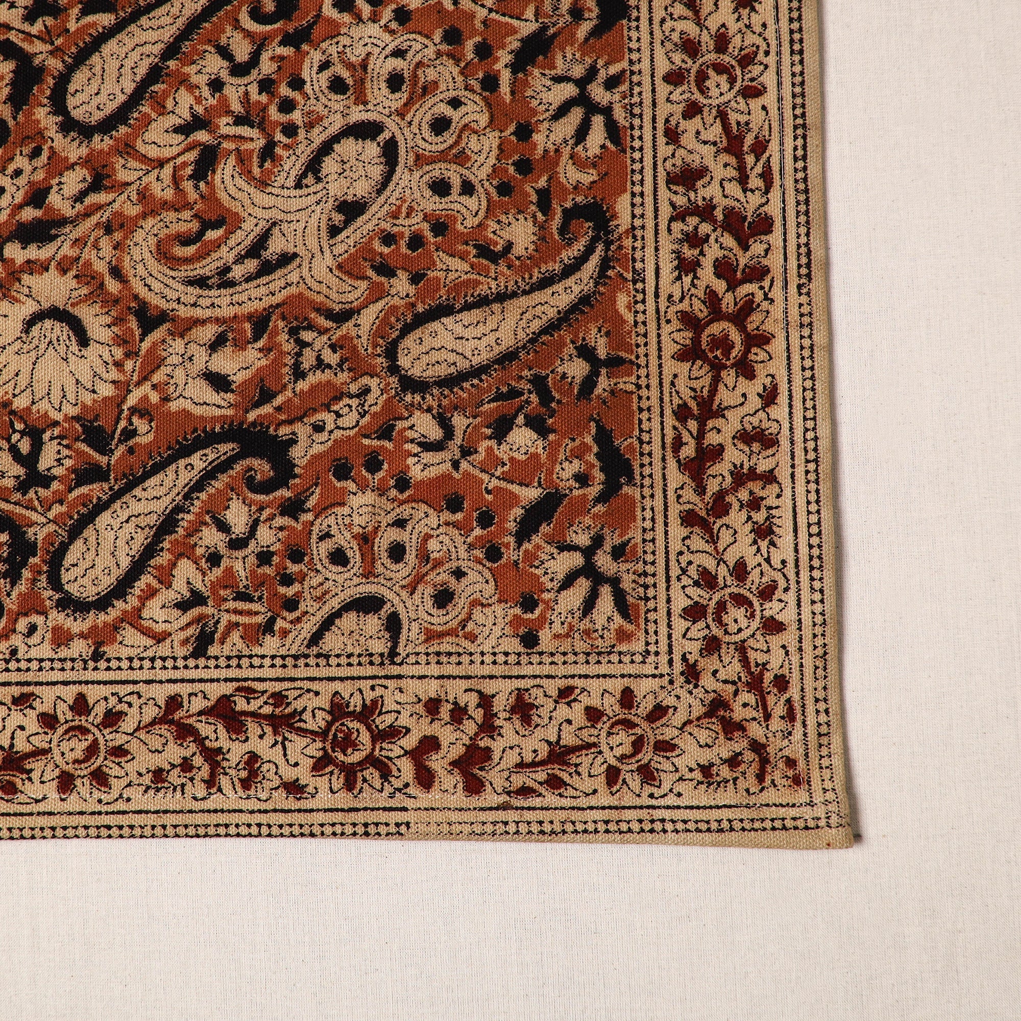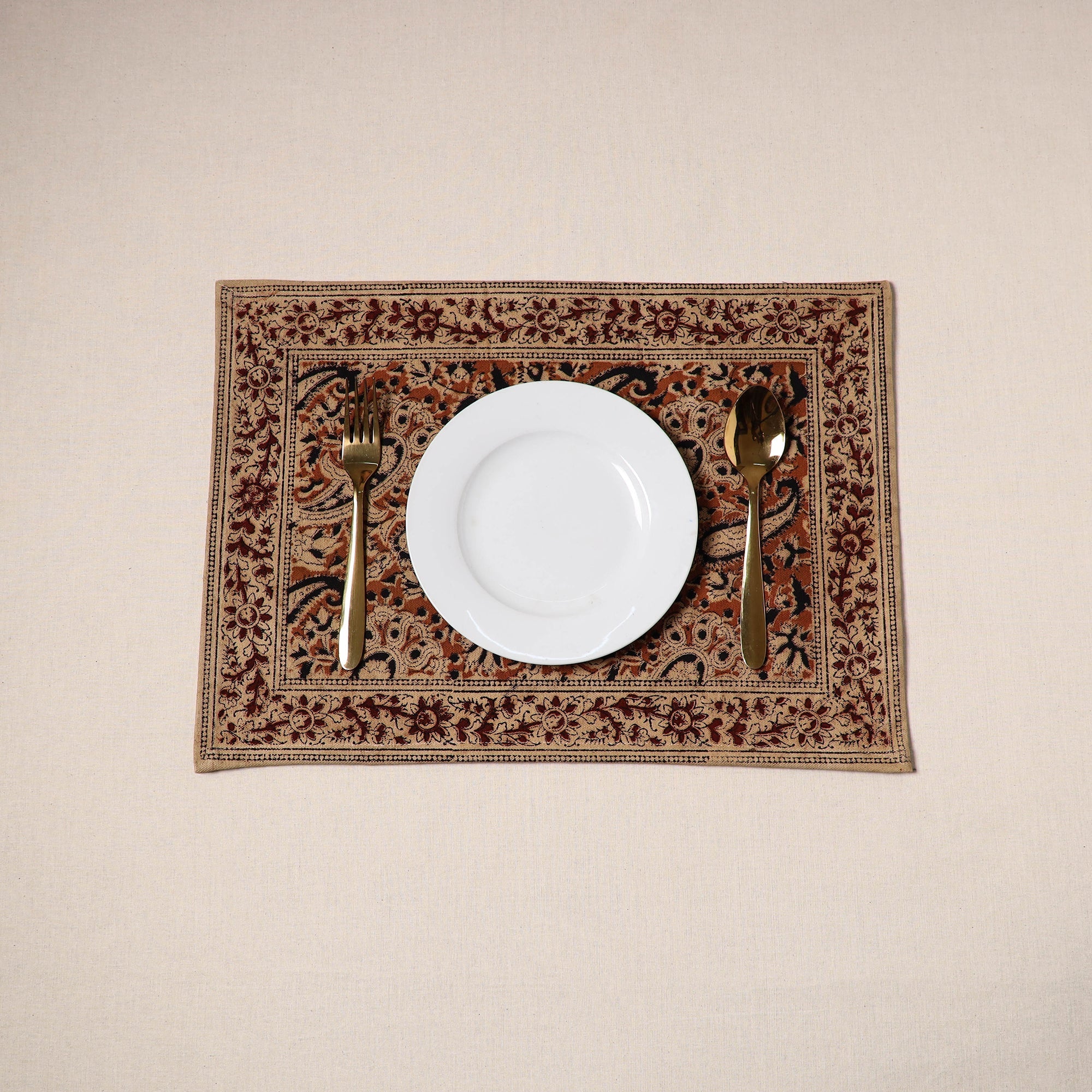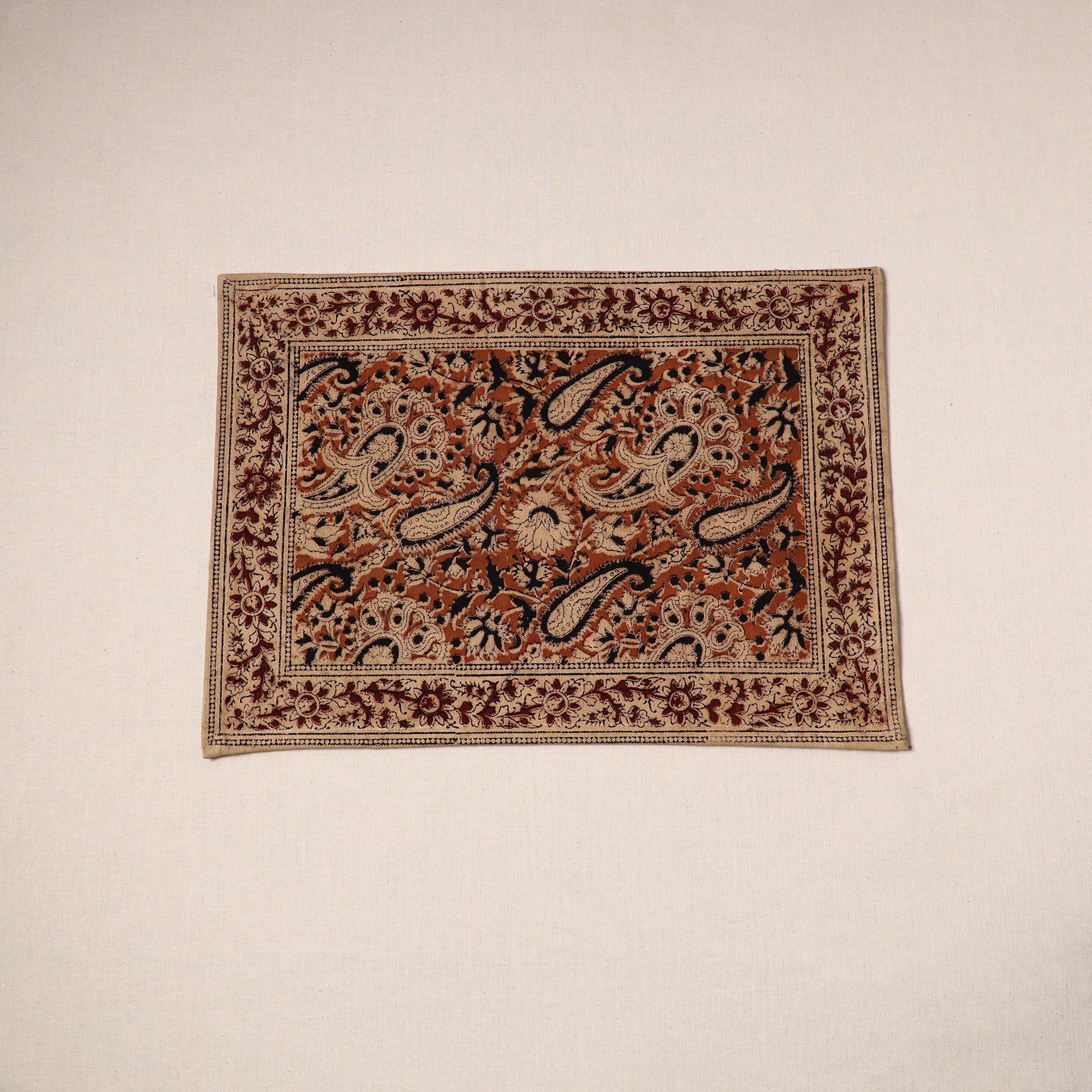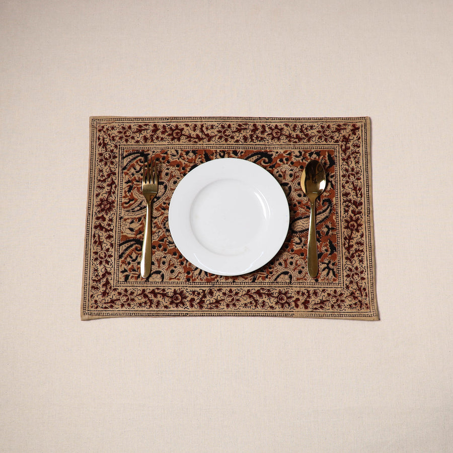 | Material | Fine-quality orange kalamkari block-printed, naturally dyed cotton table mat skillfully crafted by the artisans of Pedana. It features an assortment of hand block motifs inspired by traditional Kalamkari art. Perfect for dining tables or as decorative accents, this mat protects surfaces and adds a touch of artisanal charm to your home. |