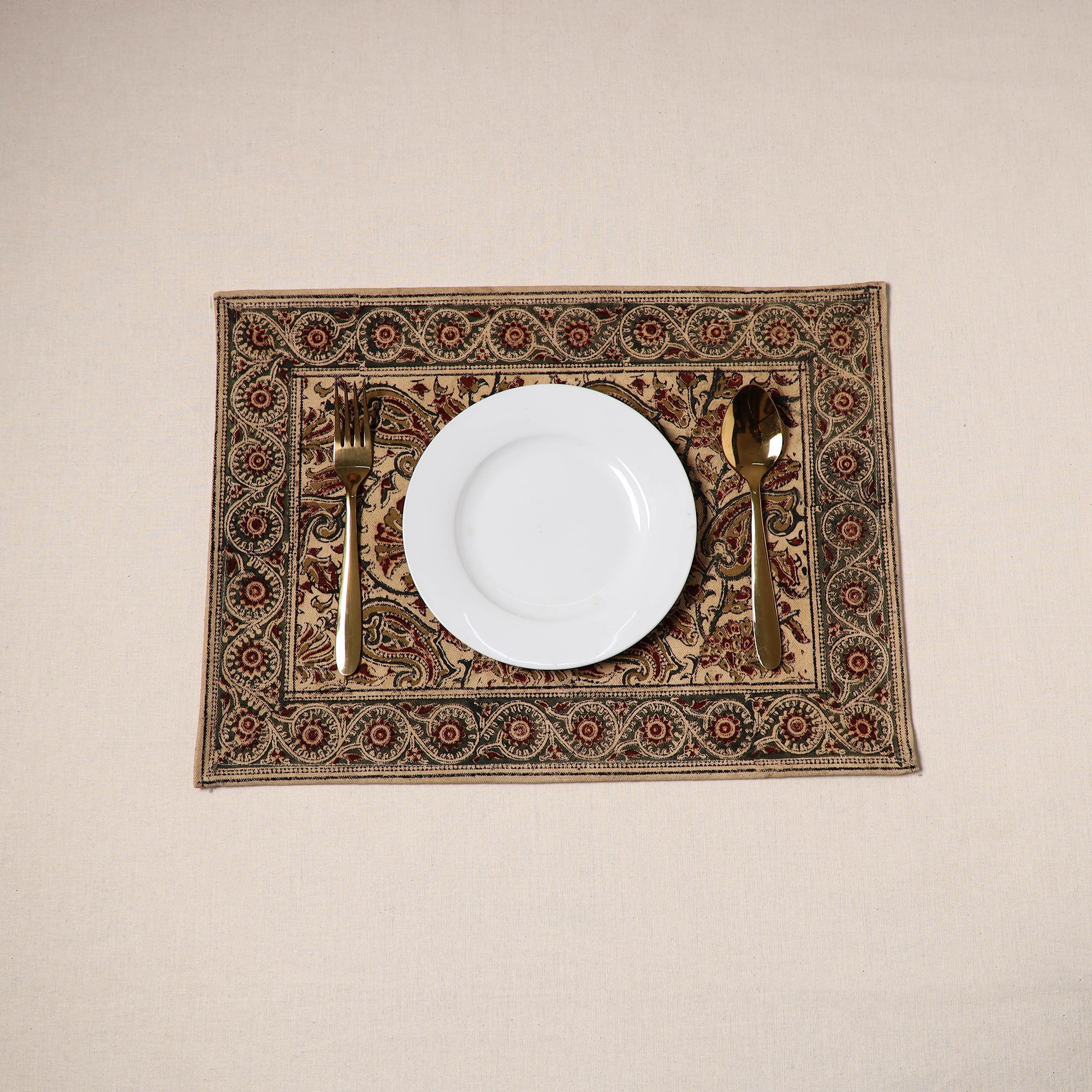 Fine-quality beige kalamkari block-printed, naturally dyed cotton table mat skillfully crafted by the artisans of Pedana. It features an assortment of hand block motifs inspired by traditional Kalamkari art. Perfect for dining tables or as decorative accents, this mat protects surfaces and adds a touch of artisanal charm to your home.