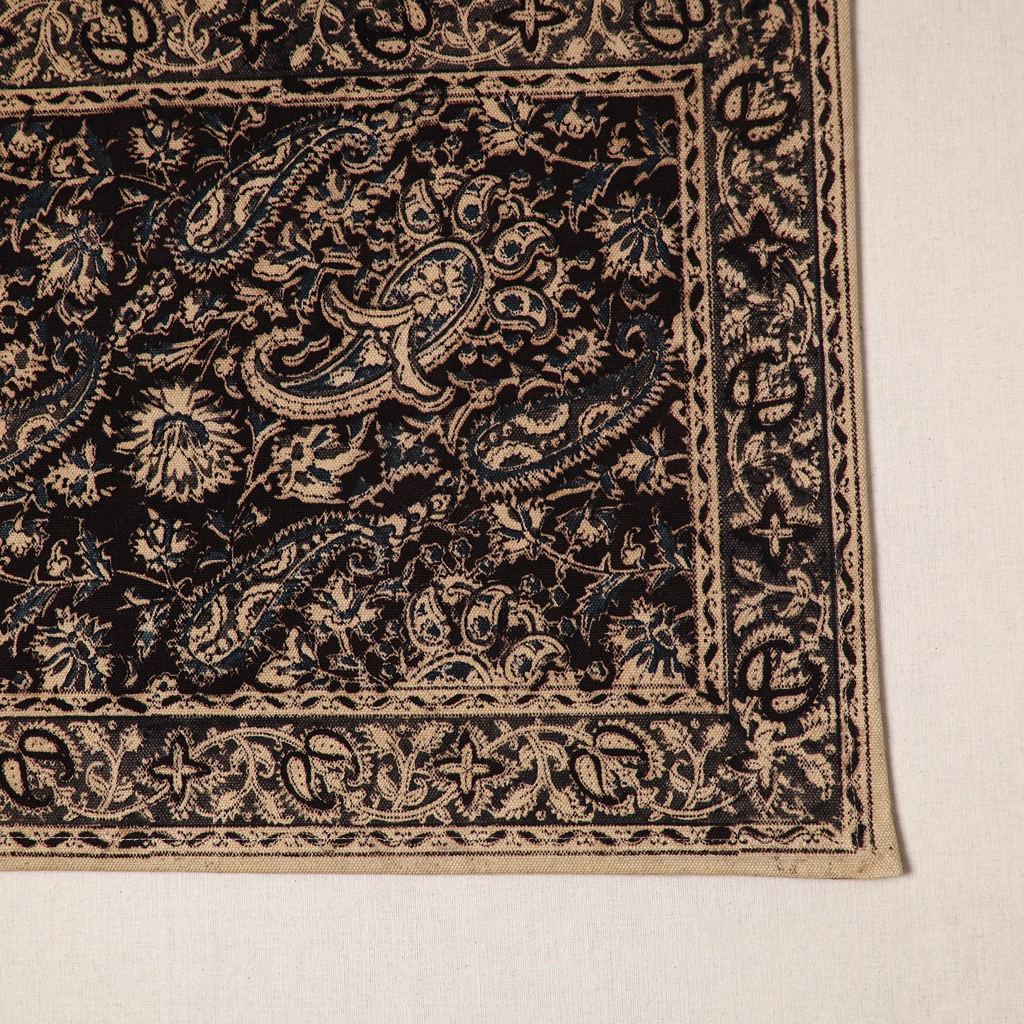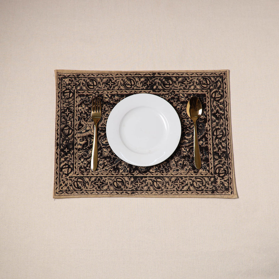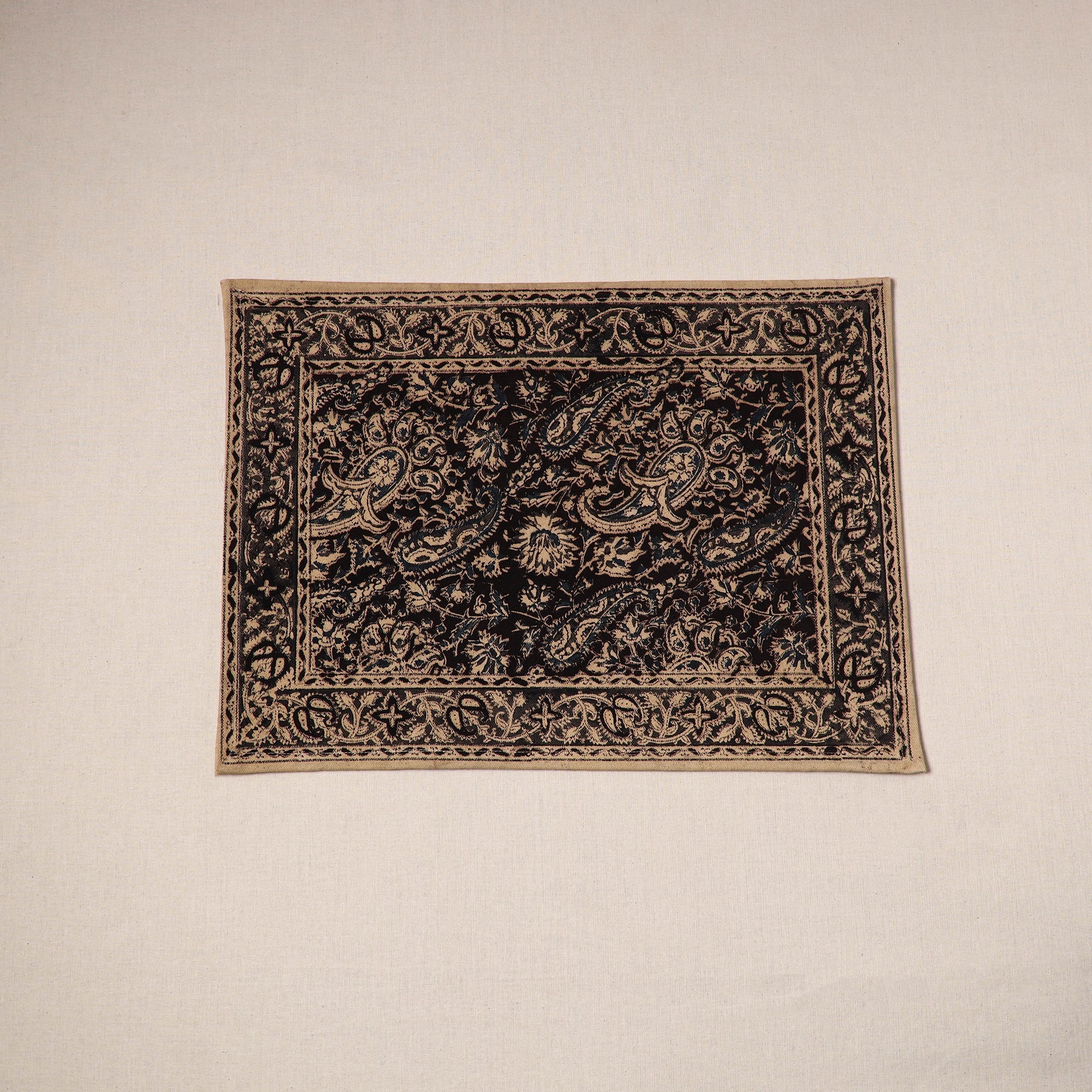 | Material | Fine-quality black kalamkari block-printed, naturally dyed cotton table mat skillfully crafted by the artisans of Pedana. It features an assortment of hand block motifs inspired by traditional Kalamkari art. Perfect for dining tables or as decorative accents, this mat protects surfaces and adds a touch of artisanal charm to your home. |