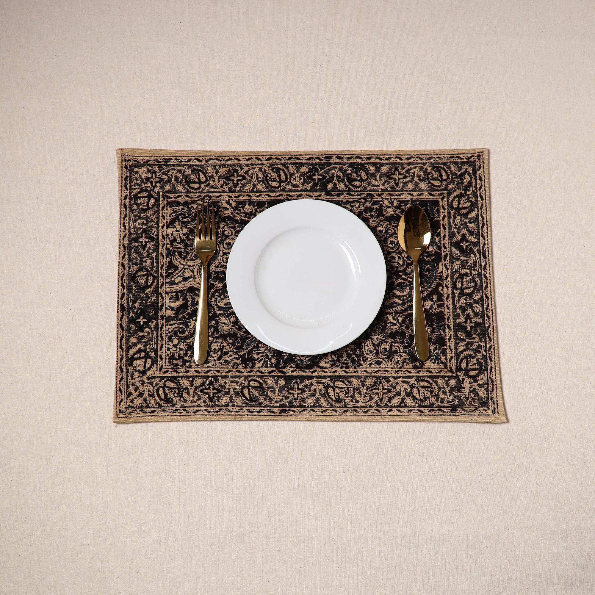 Fine-quality black kalamkari block-printed, naturally dyed cotton table mat skillfully crafted by the artisans of Pedana. It features an assortment of hand block motifs inspired by traditional Kalamkari art. Perfect for dining tables or as decorative accents, this mat protects surfaces and adds a touch of artisanal charm to your home.