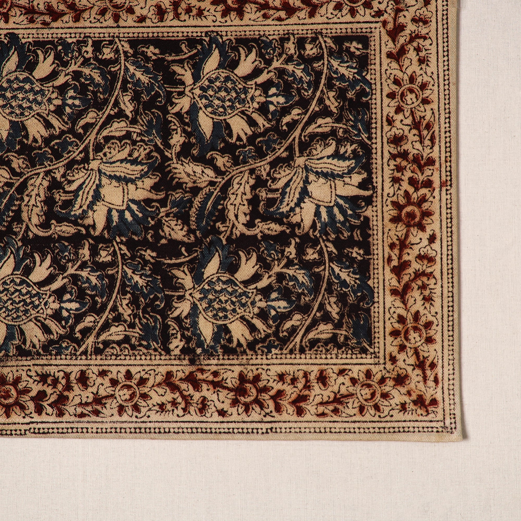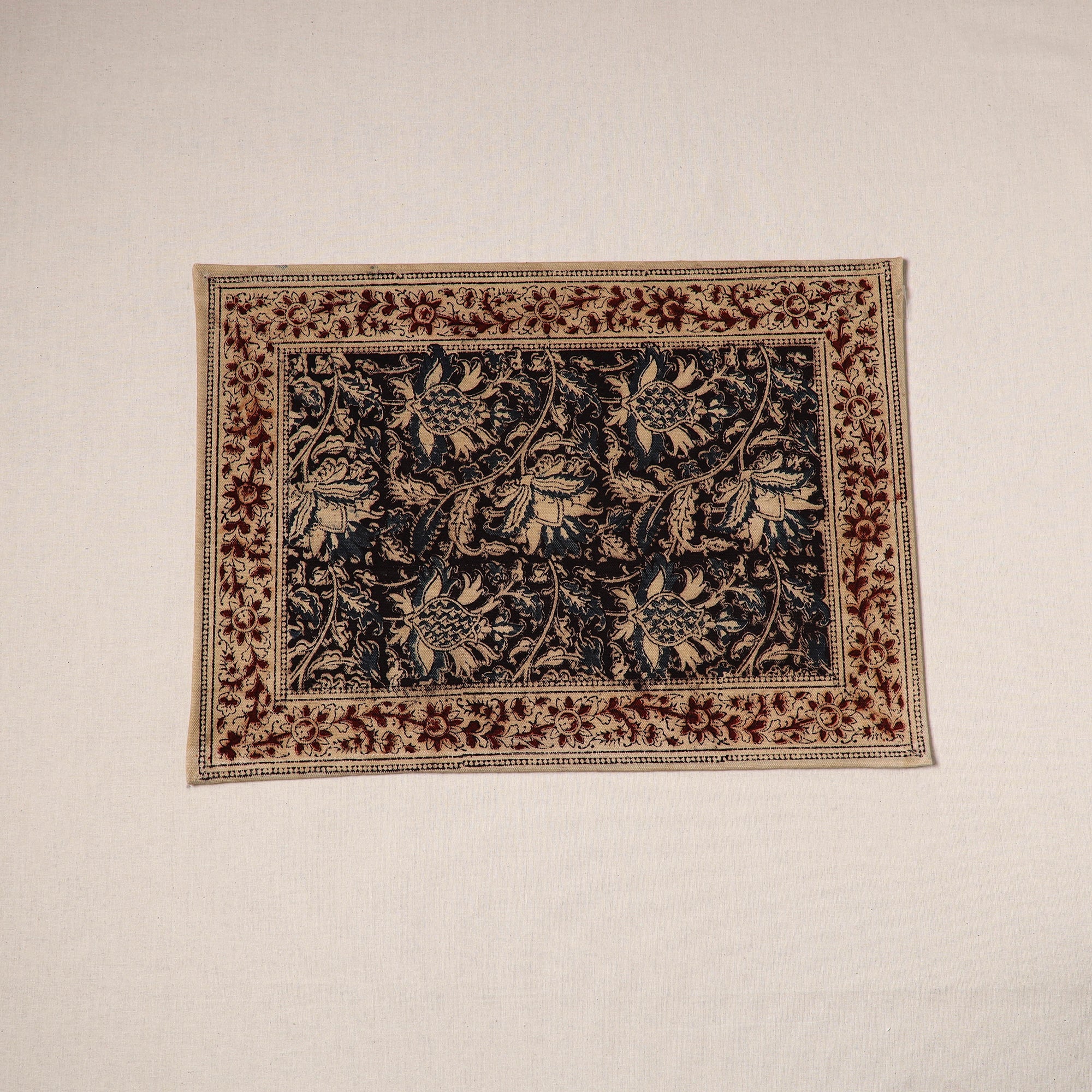 Fine-quality black kalamkari block-printed, naturally dyed cotton table mat skillfully crafted by the artisans of Pedana. It features an assortment of hand block motifs inspired by traditional Kalamkari art. Perfect for dining tables or as decorative accents, this mat protects surfaces and adds a touch of artisanal charm to your home.