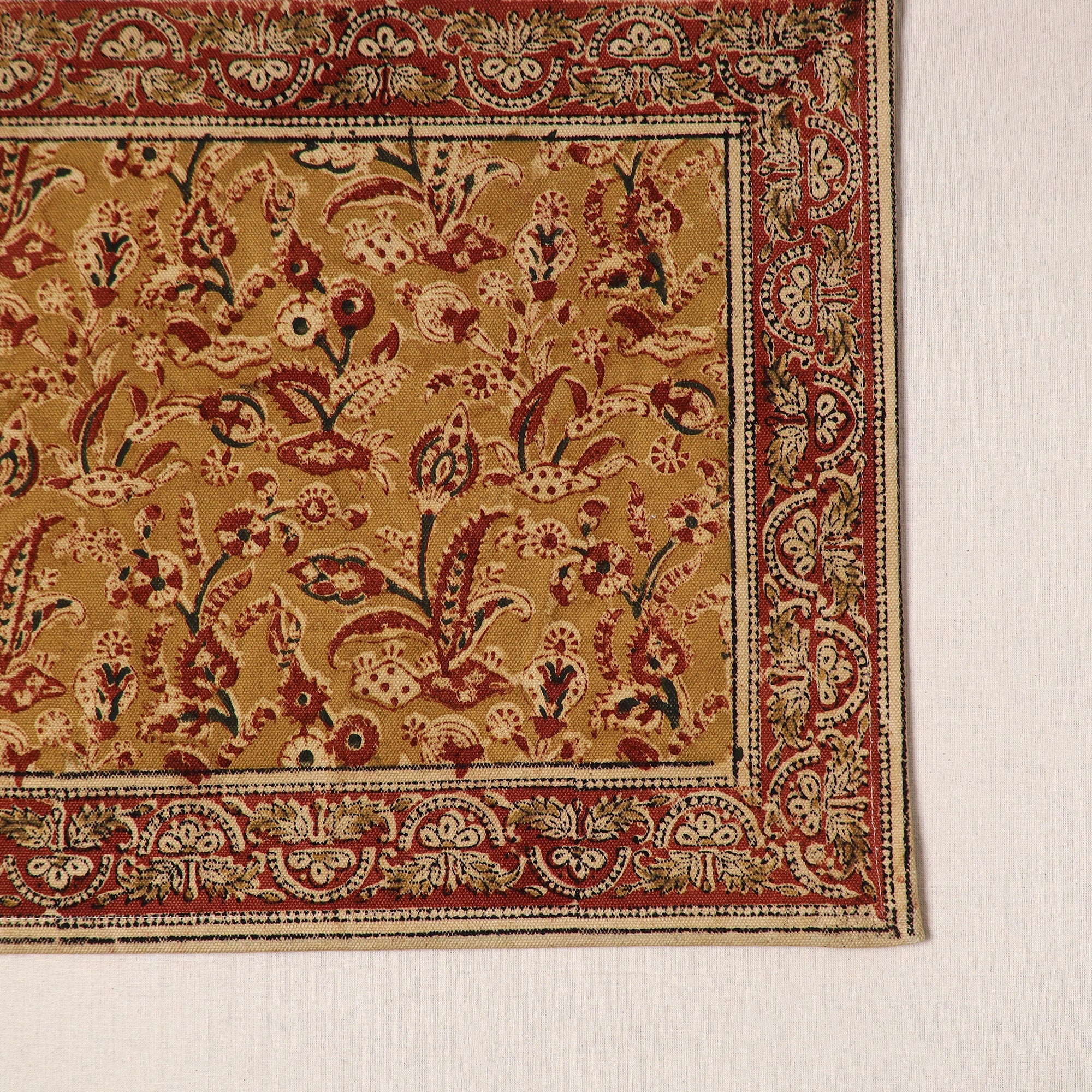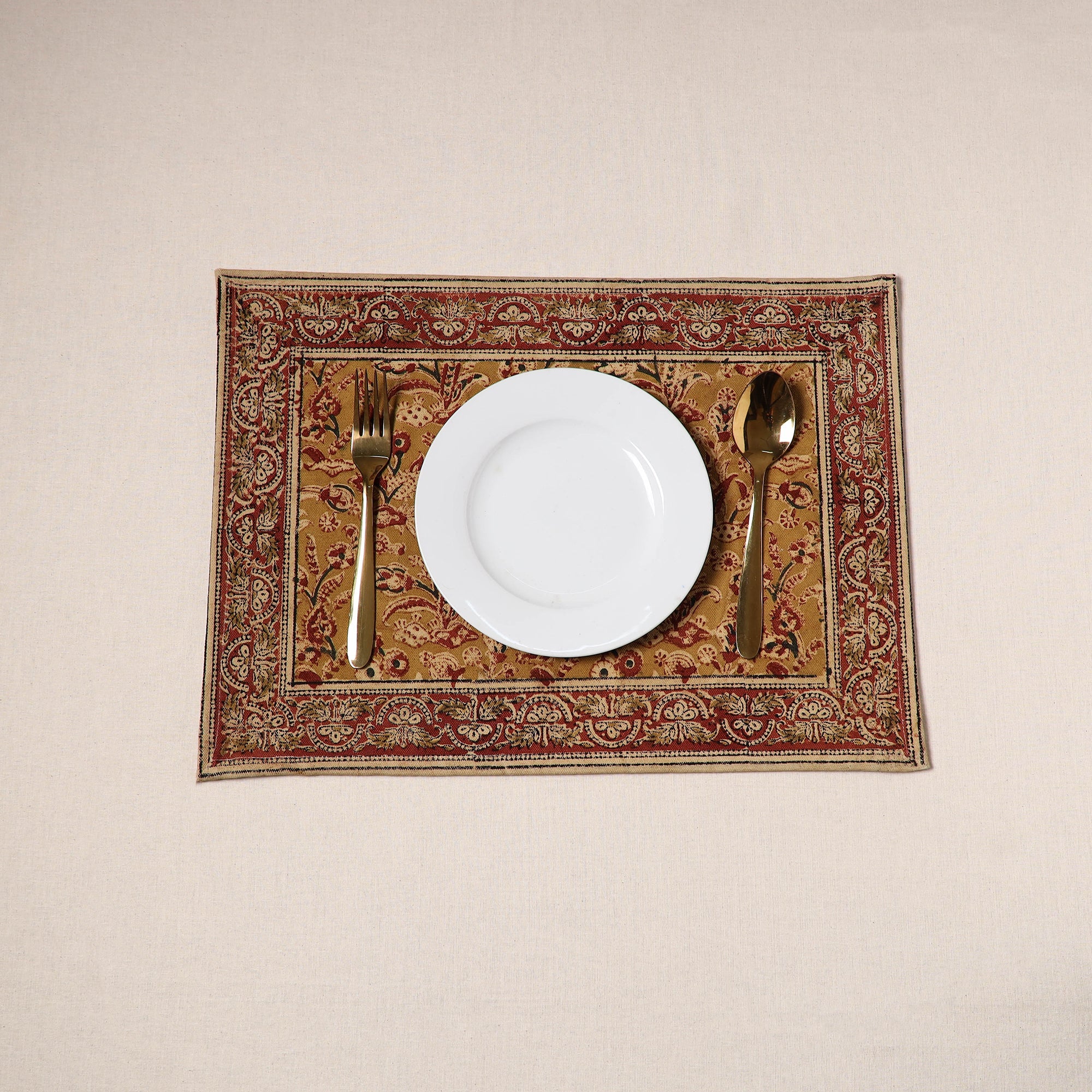 Fine-quality brown kalamkari block-printed, naturally dyed cotton table mat skillfully crafted by the artisans of Pedana. It features an assortment of hand block motifs inspired by traditional Kalamkari art. Perfect for dining tables or as decorative accents, this mat protects surfaces and adds a touch of artisanal charm to your home.