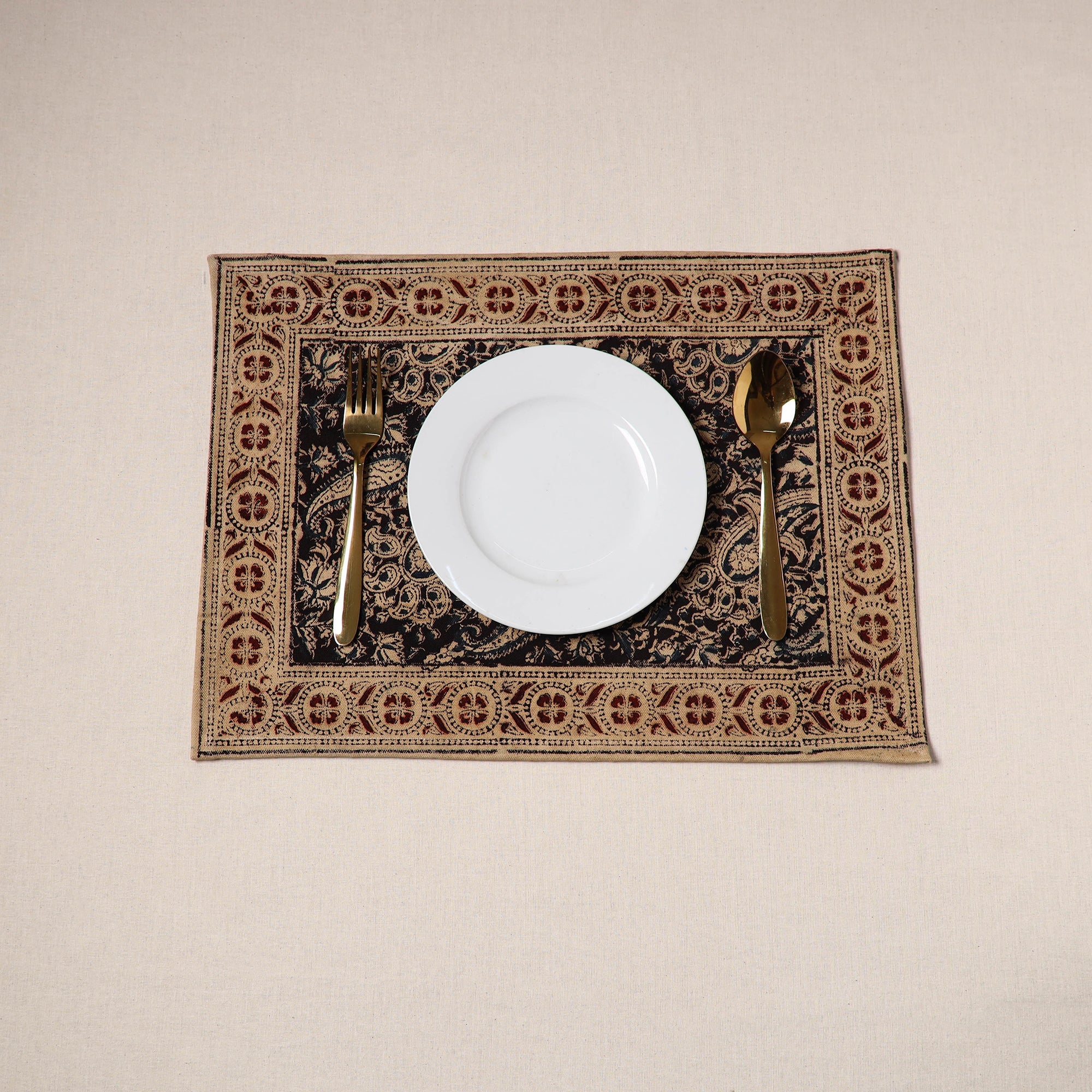 Fine-quality black kalamkari block-printed, naturally dyed cotton table mat skillfully crafted by the artisans of Pedana. It features an assortment of hand block motifs inspired by traditional Kalamkari art. Perfect for dining tables or as decorative accents, this mat protects surfaces and adds a touch of artisanal charm to your home.