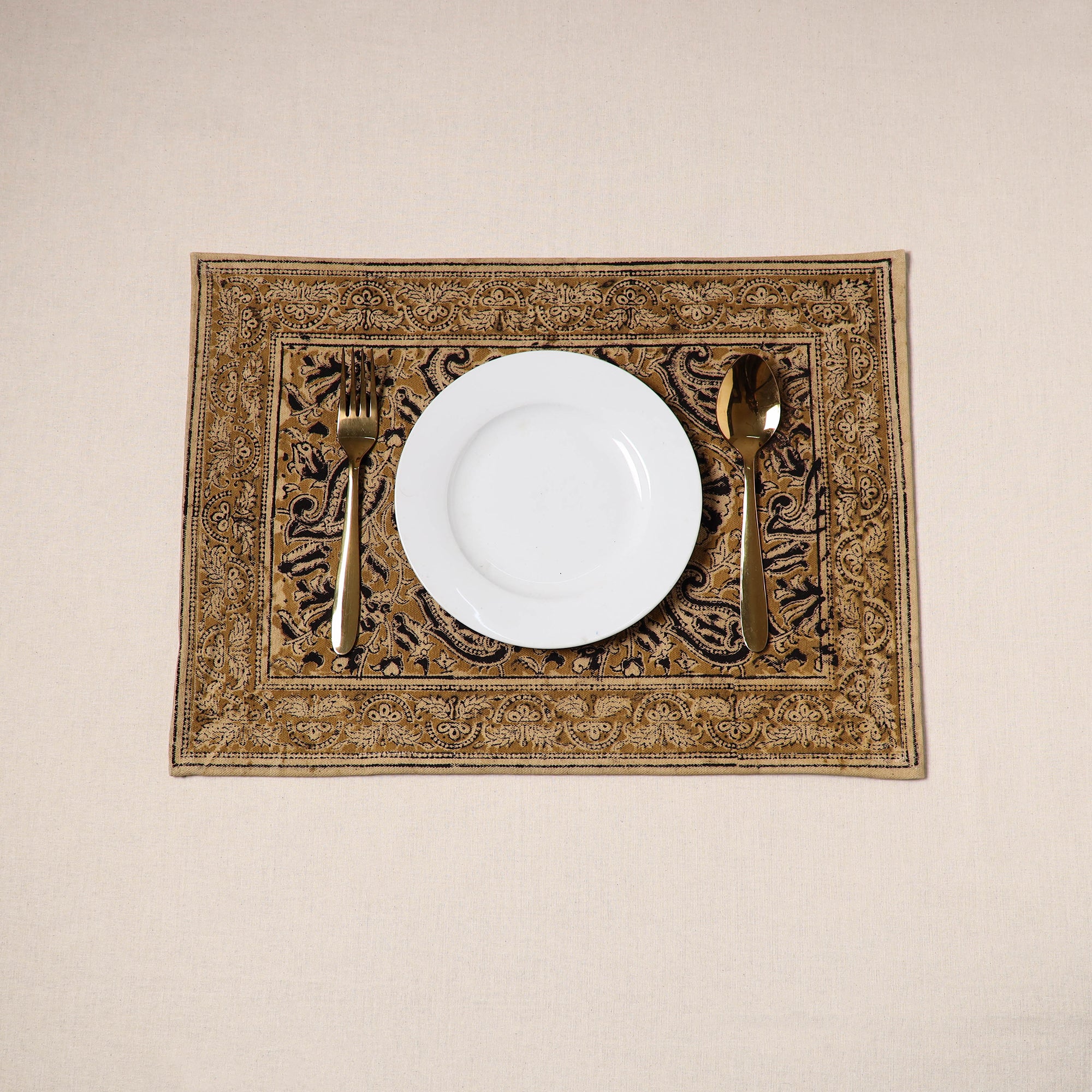 Fine-quality brown kalamkari block-printed, naturally dyed cotton table mat skillfully crafted by the artisans of Pedana. It features an assortment of hand block motifs inspired by traditional Kalamkari art. Perfect for dining tables or as decorative accents, this mat protects surfaces and adds a touch of artisanal charm to your home.