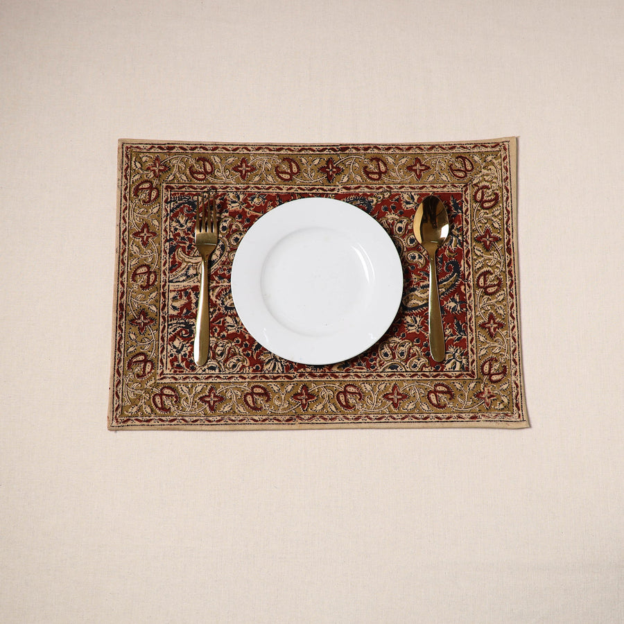 Fine-quality red kalamkari block-printed, naturally dyed cotton table mat skillfully crafted by the artisans of Pedana. It features an assortment of hand block motifs inspired by traditional Kalamkari art. Perfect for dining tables or as decorative accents, this mat protects surfaces and adds a touch of artisanal charm to your home.