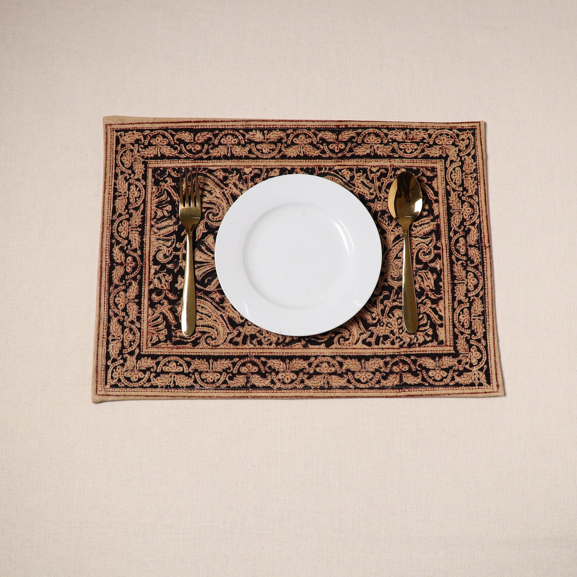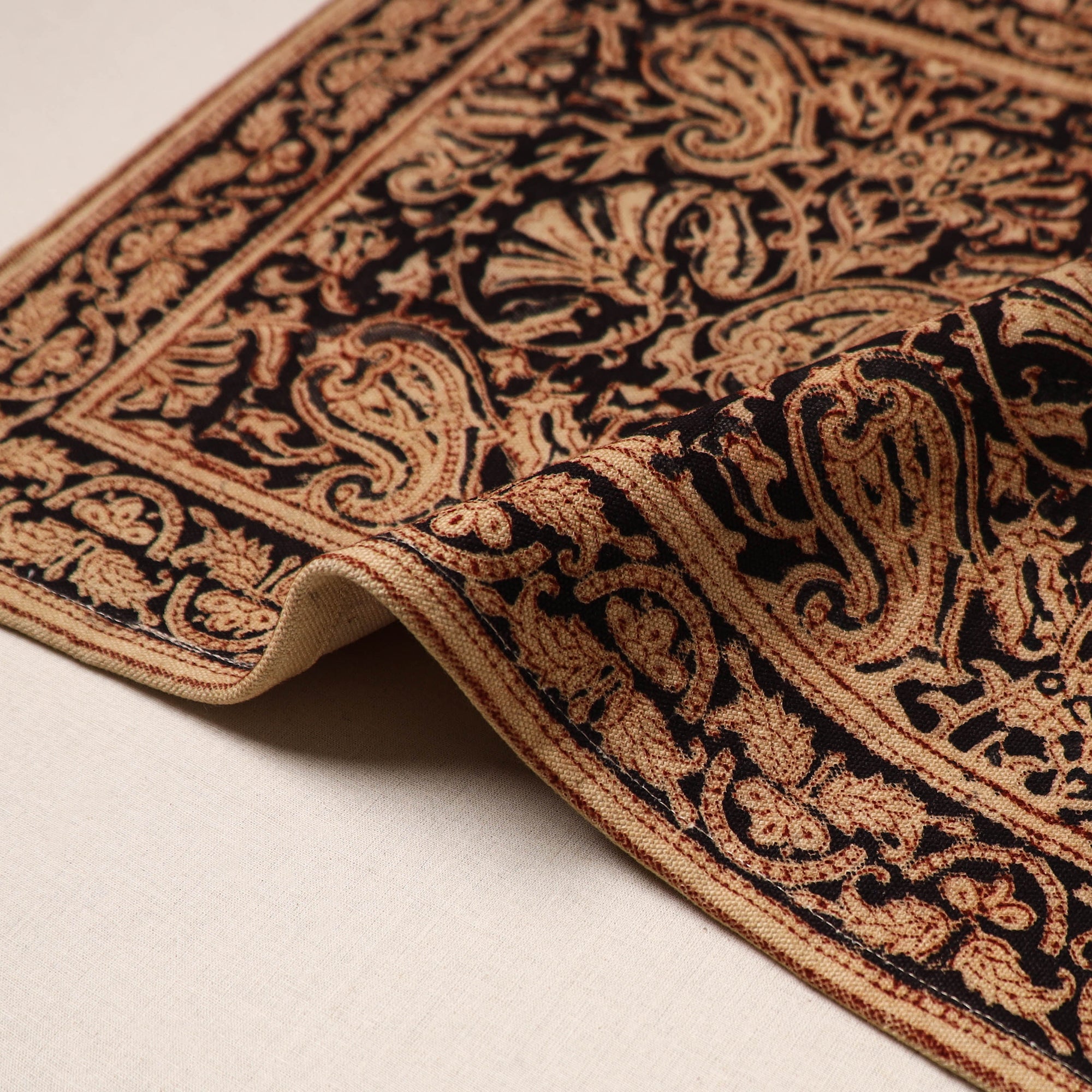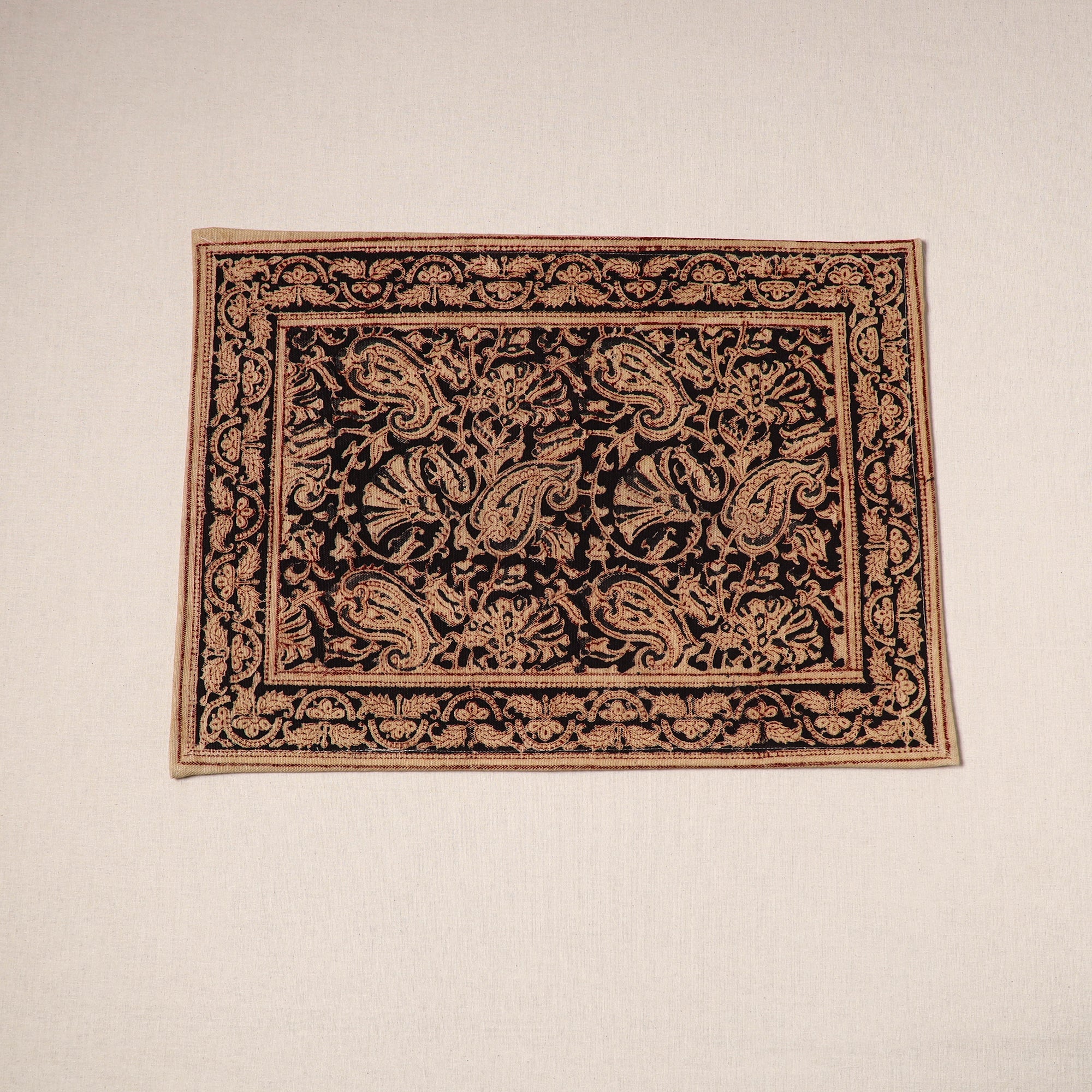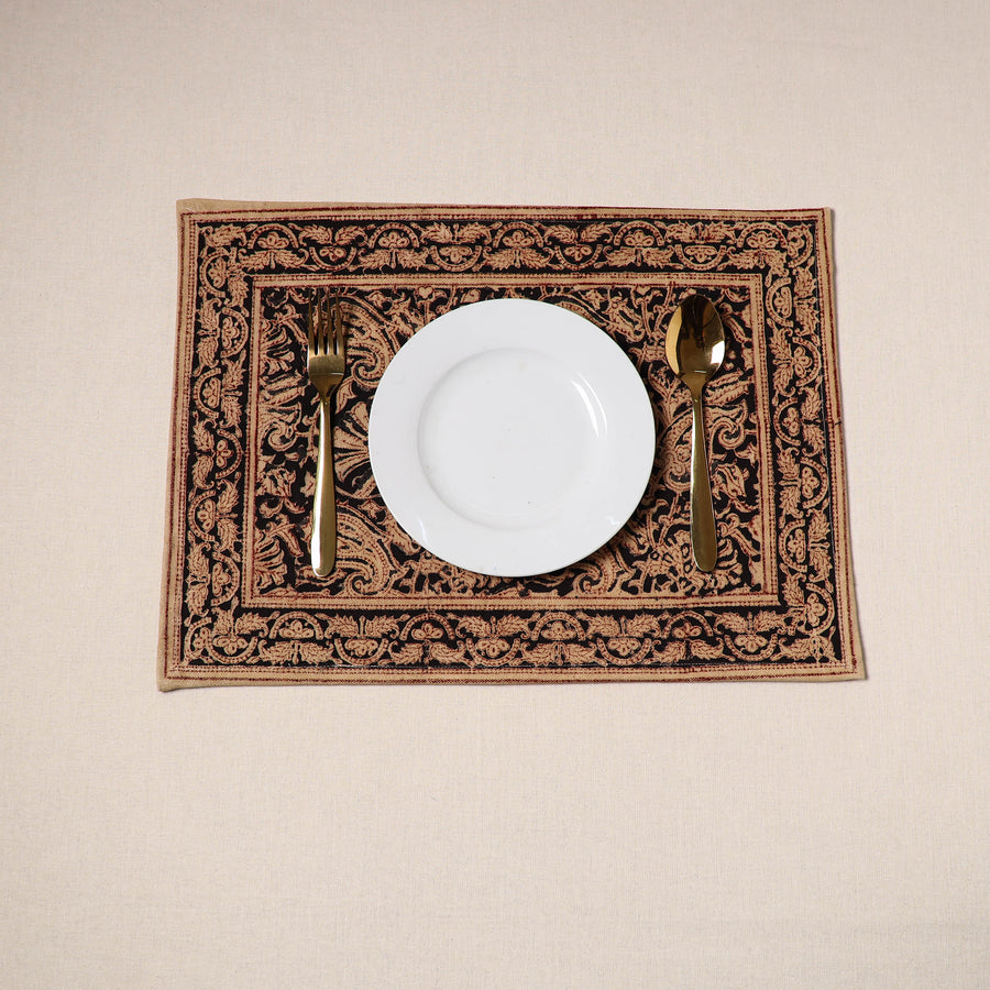 Fine-quality black kalamkari block-printed, naturally dyed cotton table mat skillfully crafted by the artisans of Pedana. It features an assortment of hand block motifs inspired by traditional Kalamkari art. Perfect for dining tables or as decorative accents, this mat protects surfaces and adds a touch of artisanal charm to your home.