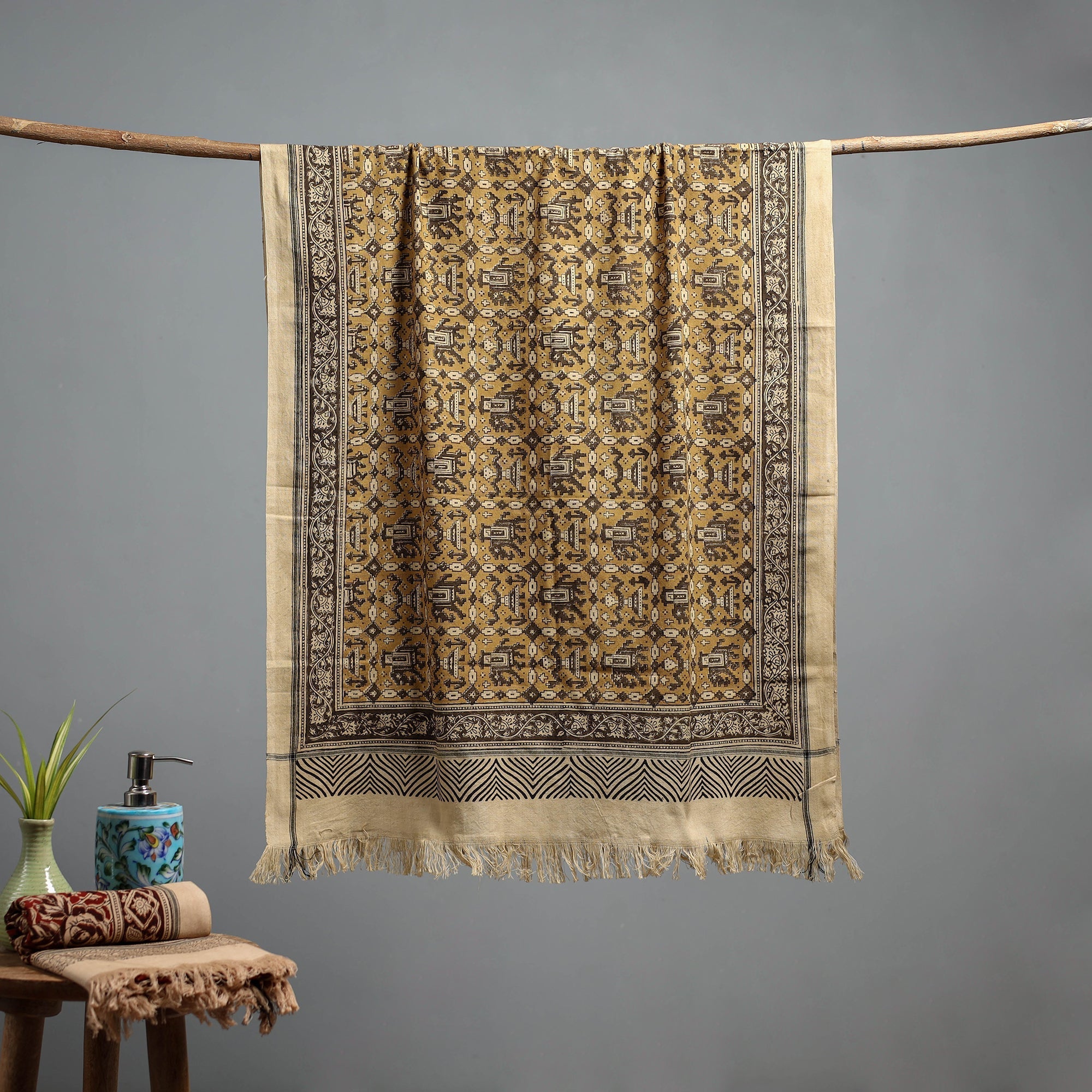 Pedana kalamkari block-printed handloom towel by master artisan Pitchuka Srinivas. Made from soft, absorbent cotton, it feels gentle on the skin and is ideal for everyday use. Carefully made in Pedana village, known for its rich textile heritage, the towel reflects detailed design and thoughtful making. Perfect for bath time, travel or gym use.