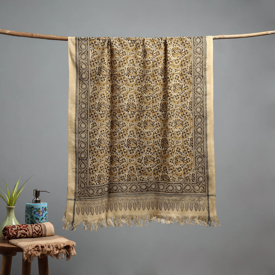 Yellow pedana kalamkari block-printed handloom towel by master artisan Pitchuka Srinivas. Made from soft, absorbent cotton, it feels gentle on the skin and is ideal for everyday use. Carefully made in Pedana village, known for its rich textile heritage, the towel reflects detailed design and thoughtful making. Perfect for bath time, travel or gym use.