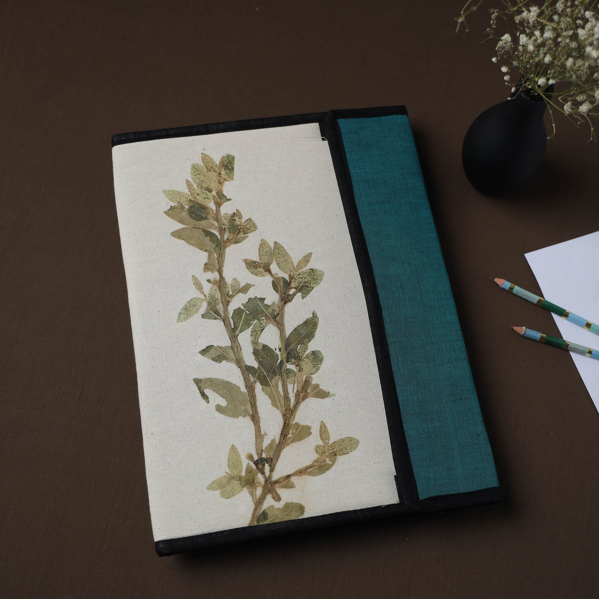 Keep your important documents stylishly organized with this white fabric file folder, featuring beautiful natural leaf artwork. Wrapped in soft handloom fabric and crafted using sturdy mount board, it offers four inner pockets to hold your papers securely. Lightweight yet tough, it’s perfect for carrying documents, notes, and important papers easily and safely. A meaningful gift for eco-conscious individuals or nature lovers.