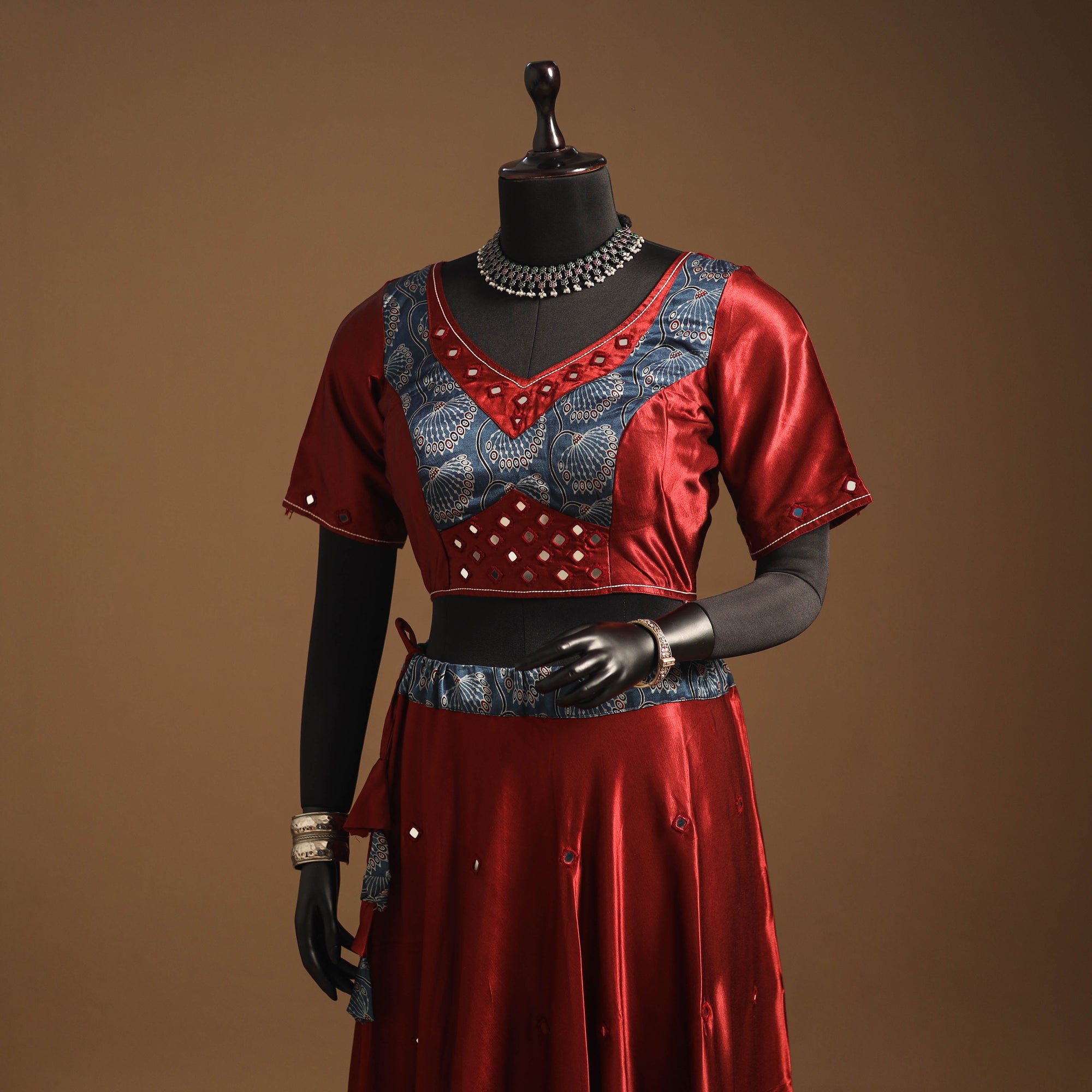 Embrace the spirit of navratri in this stunning red mashru silk chaniya choli set, detailed with ajrakh block-printed patchwork using natural dyes. Traditional Kutch embroidery meets glistening mirror accents to add that festive dazzle. The chaniya is gracefully flared with a zip and adjustable tie-up for comfort, while the choli features a back dori and secure hook fastening. This ensemble beautifully balances heritage and elegance, making it an joyful garba celebrations.