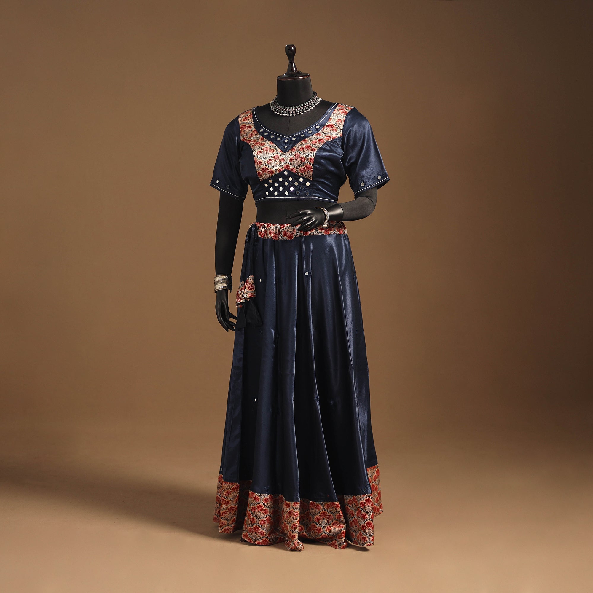 Embrace the spirit of navratri in this stunning blue mashru silk chaniya choli set, detailed with ajrakh block-printed patchwork using natural dyes. Traditional Kutch embroidery meets glistening mirror accents to add that festive dazzle. The chaniya is gracefully flared with a zip and adjustable tie-up for comfort, while the choli features a back dori and secure hook fastening. This ensemble beautifully balances heritage and elegance, making it an joyful garba celebrations.