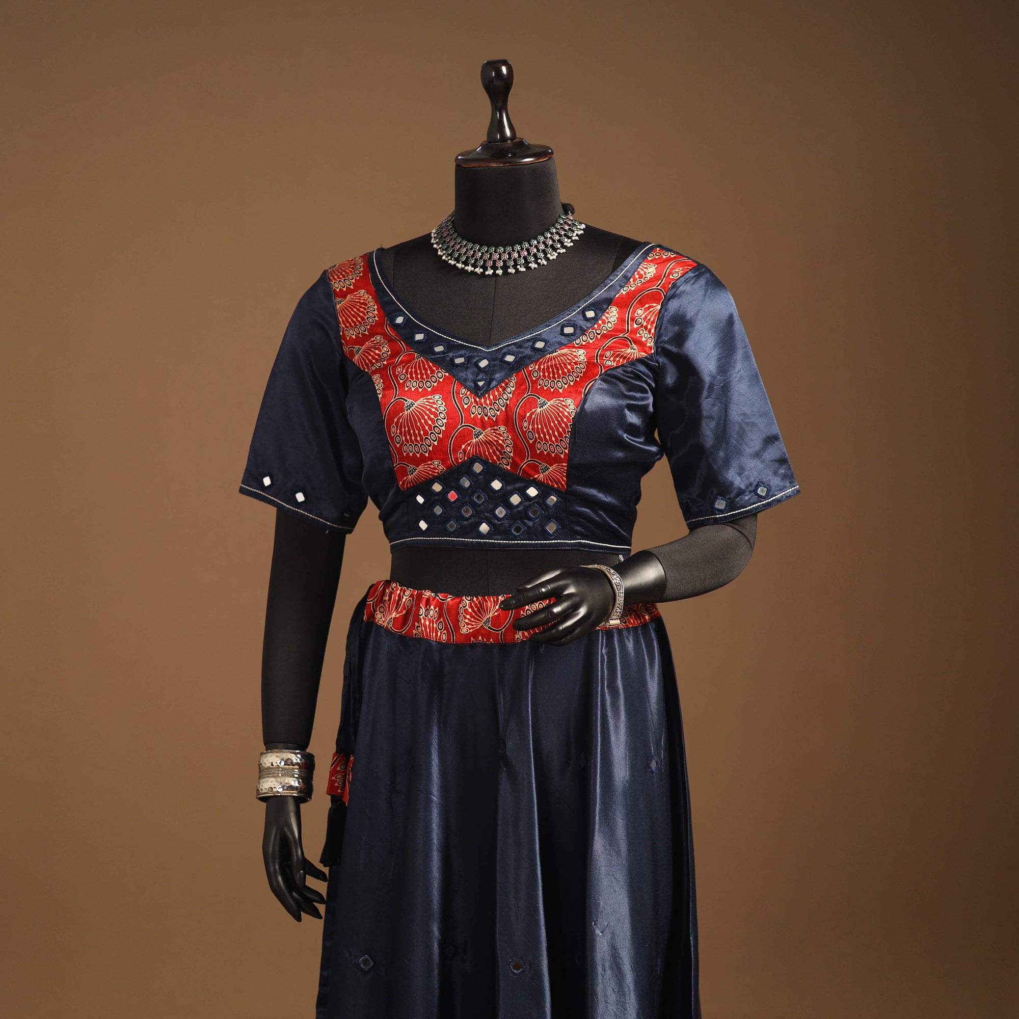 Embrace the spirit of navratri in this stunning blue mashru silk chaniya choli set, detailed with ajrakh block-printed patchwork using natural dyes. Traditional Kutch embroidery meets glistening mirror accents to add that festive dazzle. The chaniya is gracefully flared with a zip and adjustable tie-up for comfort, while the choli features a back dori and secure hook fastening. This ensemble beautifully balances heritage and elegance, making it an joyful garba celebrations.