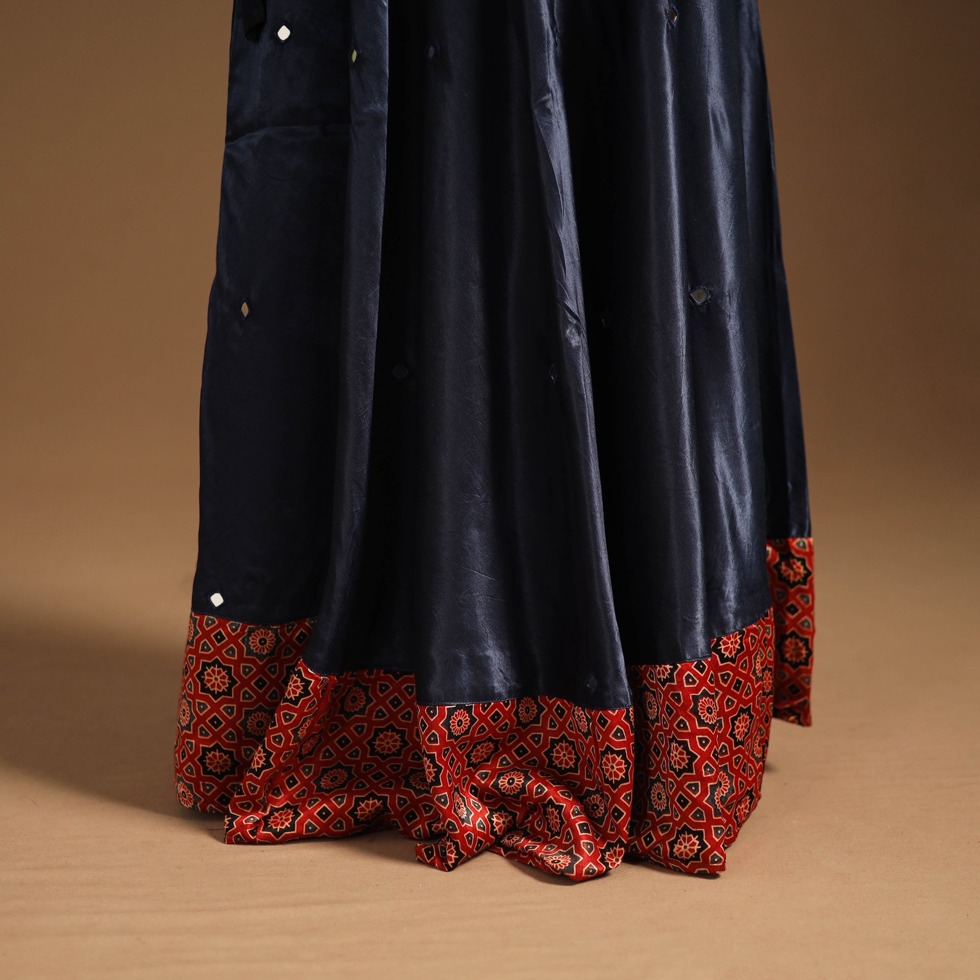 Embrace the spirit of navratri in this stunning blue mashru silk chaniya choli set, detailed with ajrakh block-printed patchwork using natural dyes. Traditional Kutch embroidery meets glistening mirror accents to add that festive dazzle. The chaniya is gracefully flared with a zip and adjustable tie-up for comfort, while the choli features a back dori and secure hook fastening. This ensemble beautifully balances heritage and elegance, making it an joyful garba celebrations.