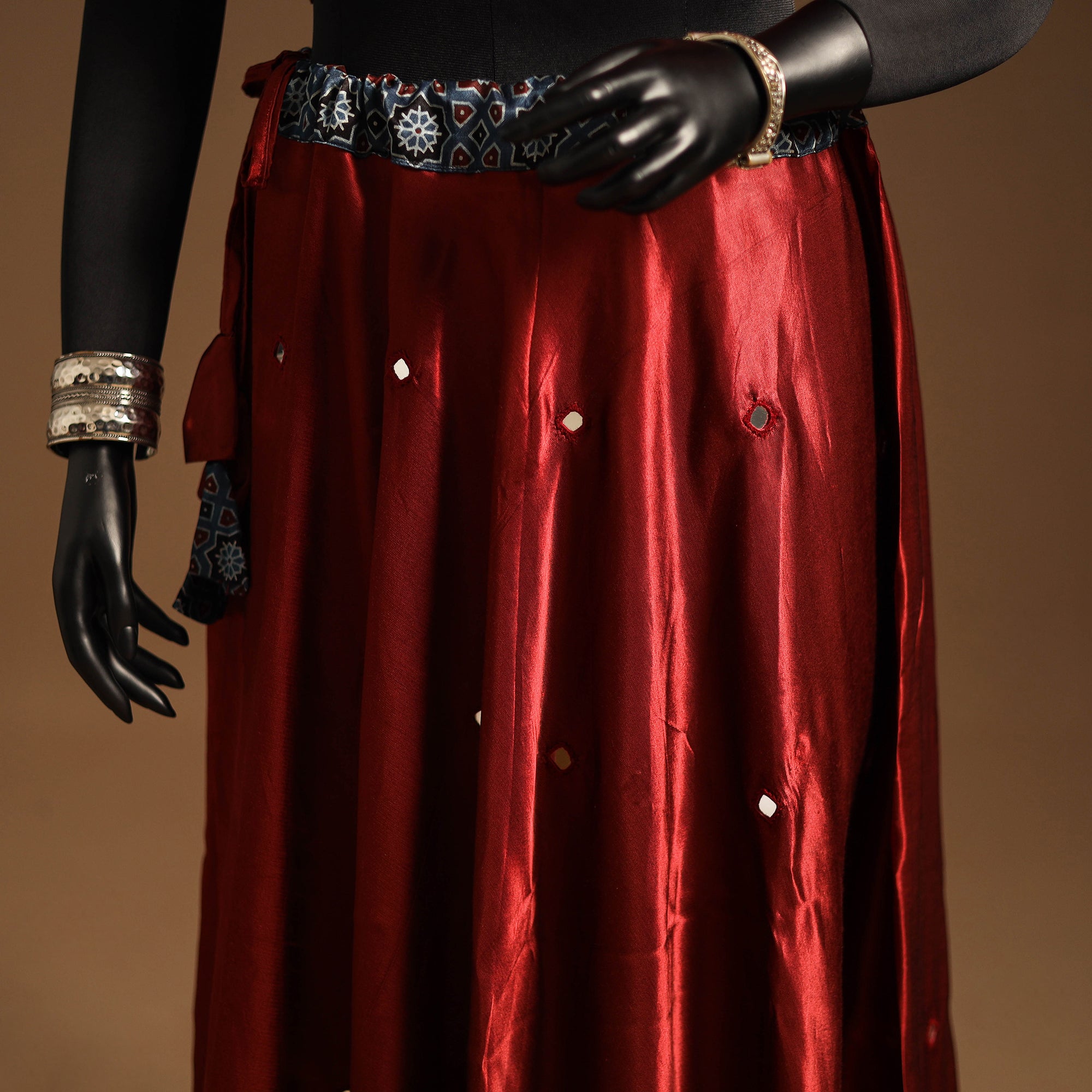 Embrace the spirit of navratri in this stunning red mashru silk chaniya choli set, detailed with ajrakh block-printed patchwork using natural dyes. Traditional Kutch embroidery meets glistening mirror accents to add that festive dazzle. The chaniya is gracefully flared with a zip and adjustable tie-up for comfort, while the choli features a back dori and secure hook fastening. This ensemble beautifully balances heritage and elegance, making it an joyful garba celebrations.