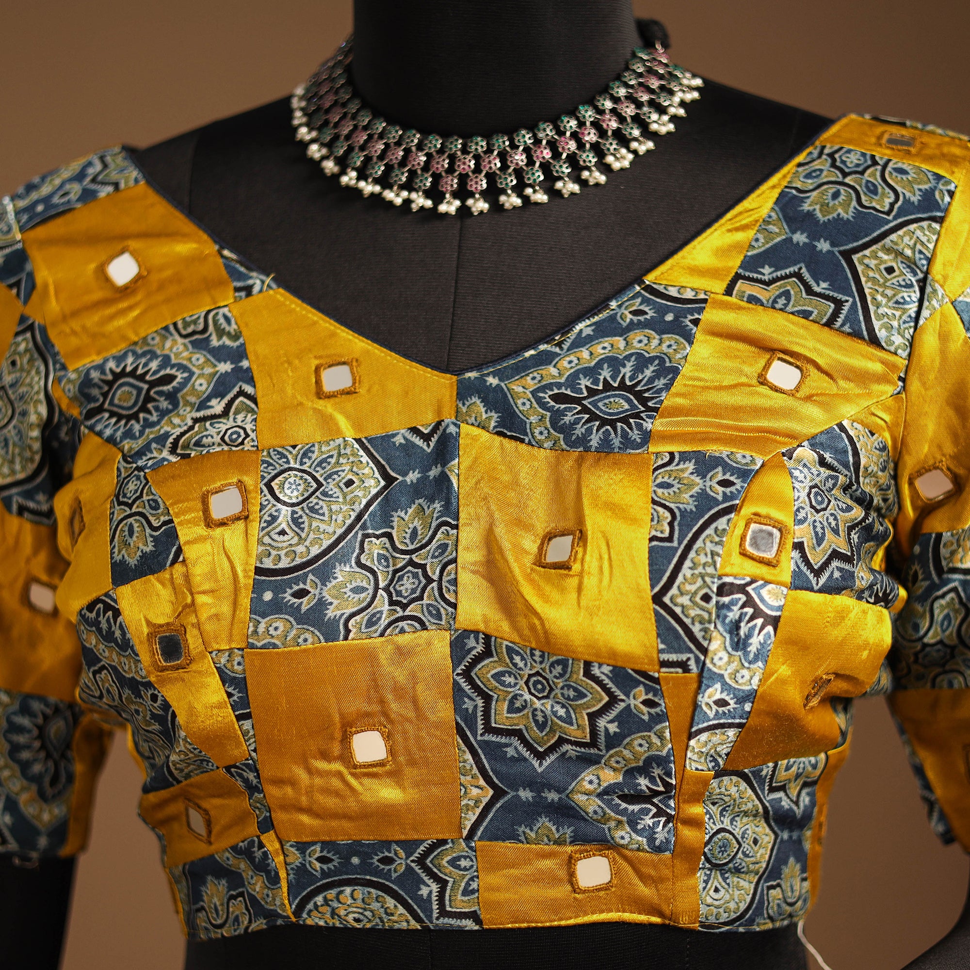 Embrace the spirit of navratri in this stunning yellow mashru silk chaniya choli set, detailed with ajrakh block-printed patchwork using natural dyes. Traditional Kutch embroidery meets glistening mirror accents to add that festive dazzle. The chaniya is gracefully flared with a zip and adjustable tie-up for comfort, while the choli features a back dori and secure hook fastening. This ensemble beautifully balances heritage and elegance, making it an joyful garba celebrations.