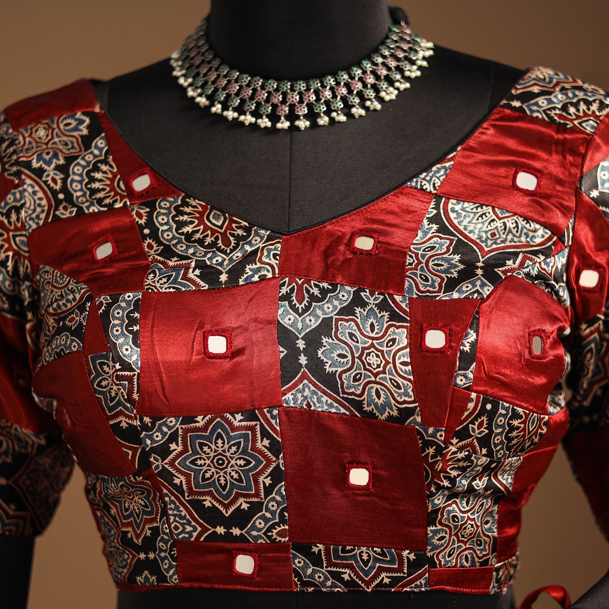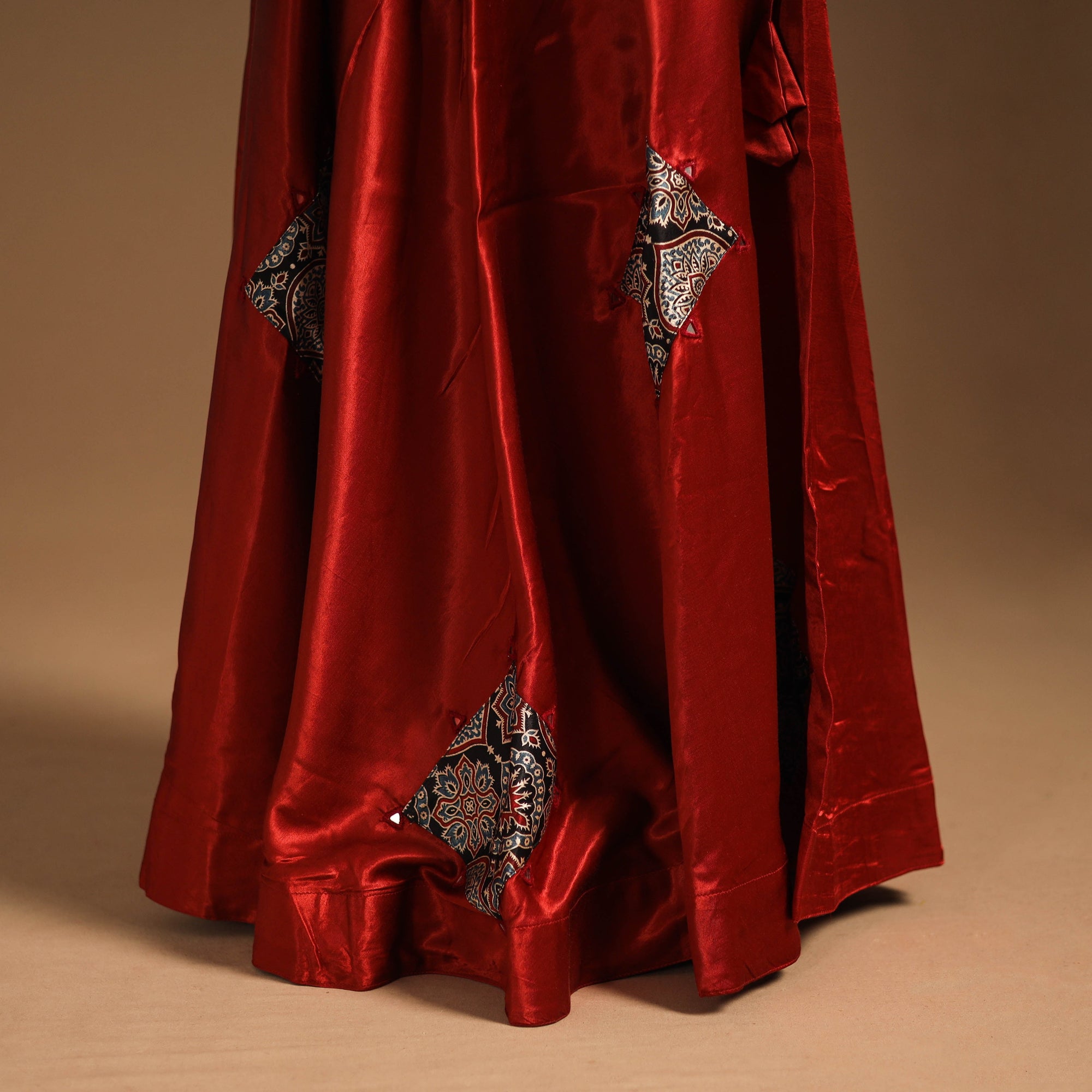 Embrace the spirit of navratri in this stunning red mashru silk chaniya choli set, detailed with ajrakh block-printed patchwork using natural dyes. Traditional Kutch embroidery meets glistening mirror accents to add that festive dazzle. The chaniya is gracefully flared with a zip and adjustable tie-up for comfort, while the choli features a back dori and secure hook fastening. This ensemble beautifully balances heritage and elegance, making it an joyful garba celebrations.