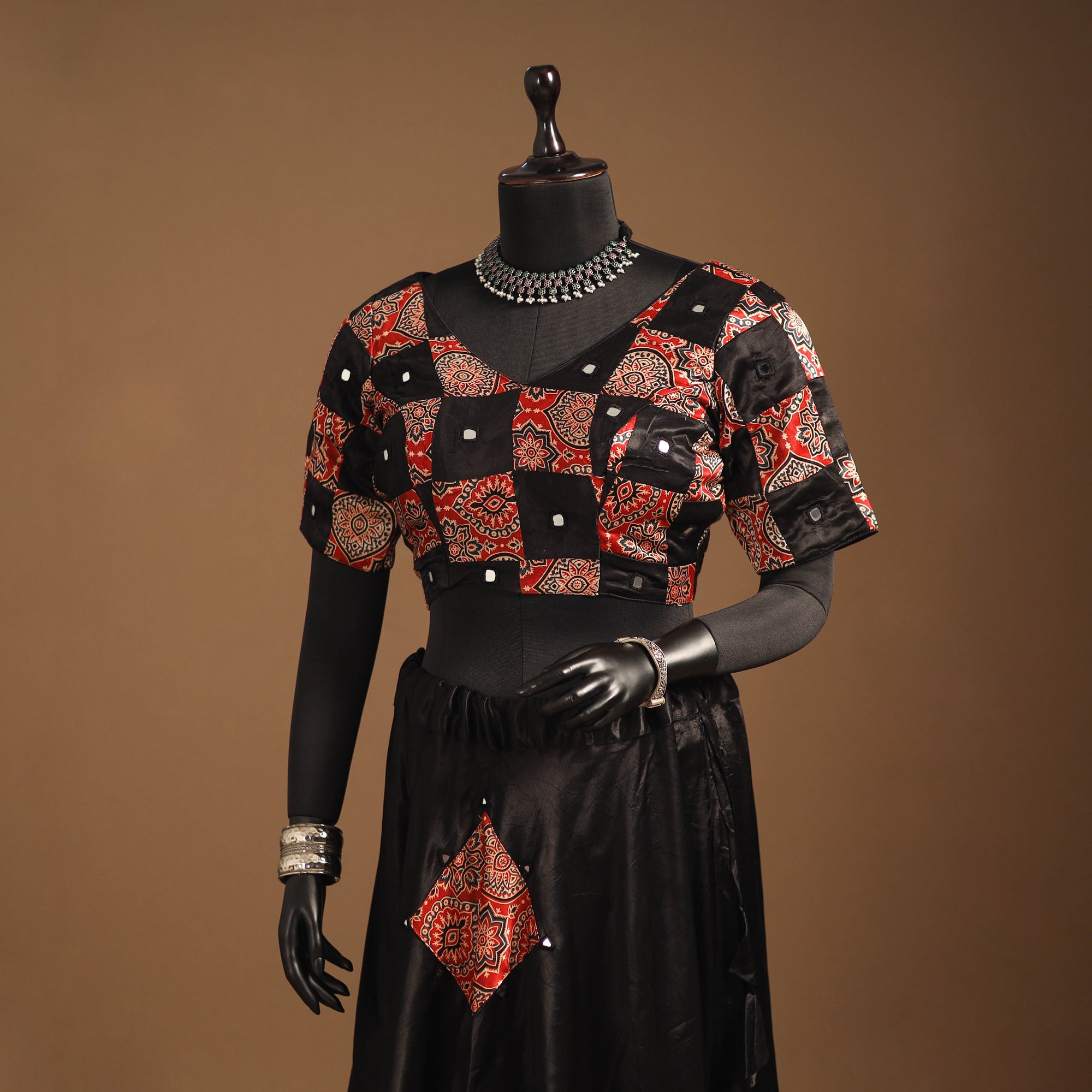 Embrace the spirit of navratri in this stunning black mashru silk chaniya choli set, detailed with ajrakh block-printed patchwork using natural dyes. Traditional Kutch embroidery meets glistening mirror accents to add that festive dazzle. The chaniya is gracefully flared with a zip and adjustable tie-up for comfort, while the choli features a back dori and secure hook fastening. This ensemble beautifully balances heritage and elegance, making it an joyful garba celebrations.