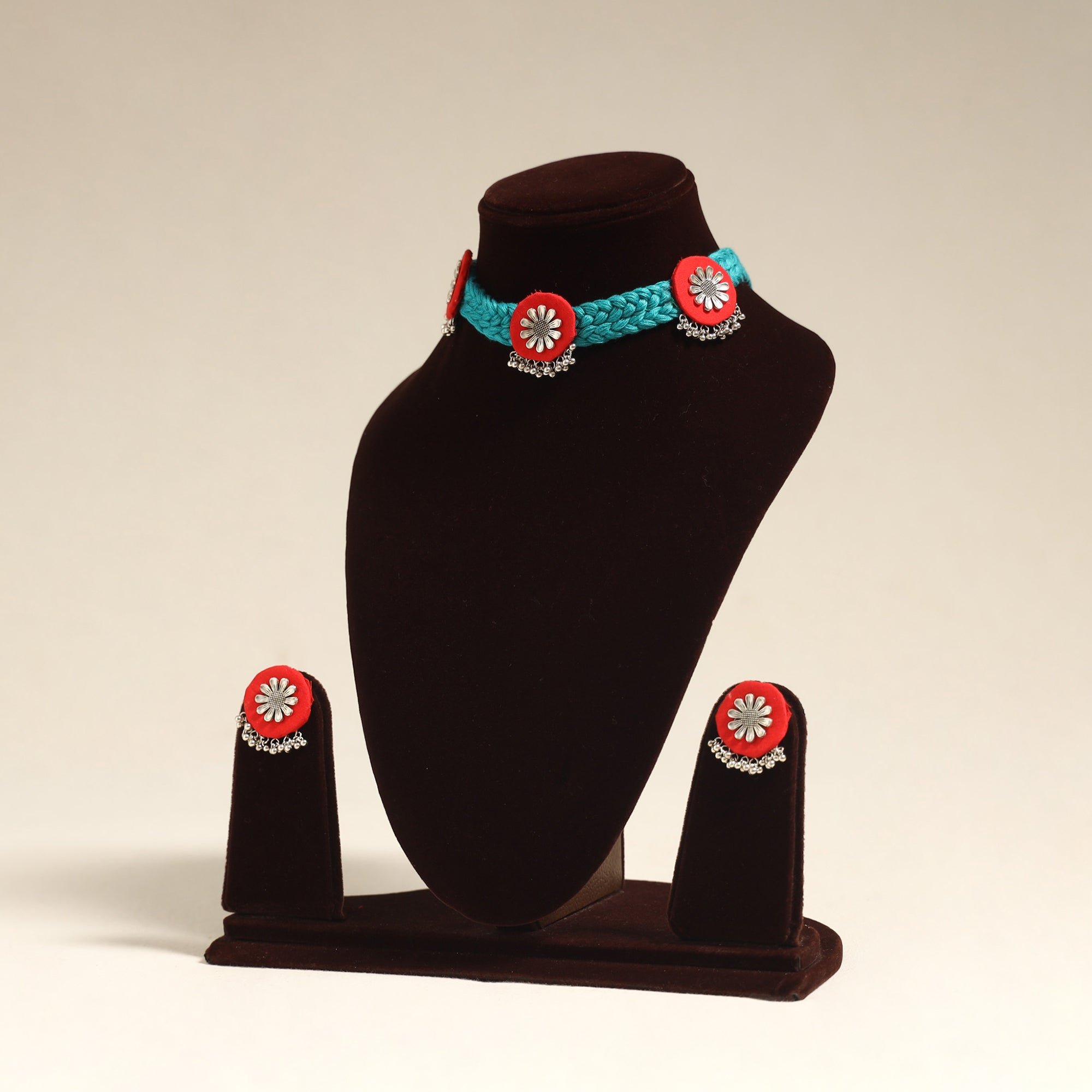 Add a touch of handmade charm to your ensemble with this elegant blue fabart german silver necklace set. The set includes matching earrings to effortlessly elevate your traditional or Indo-fusion look. Carefully handcrafted by skilled artisans, it is perfect for festive occasions, cultural events, or for adding a distinctive flair to your everyday style. It also makes a thoughtful gift for your loved ones.
