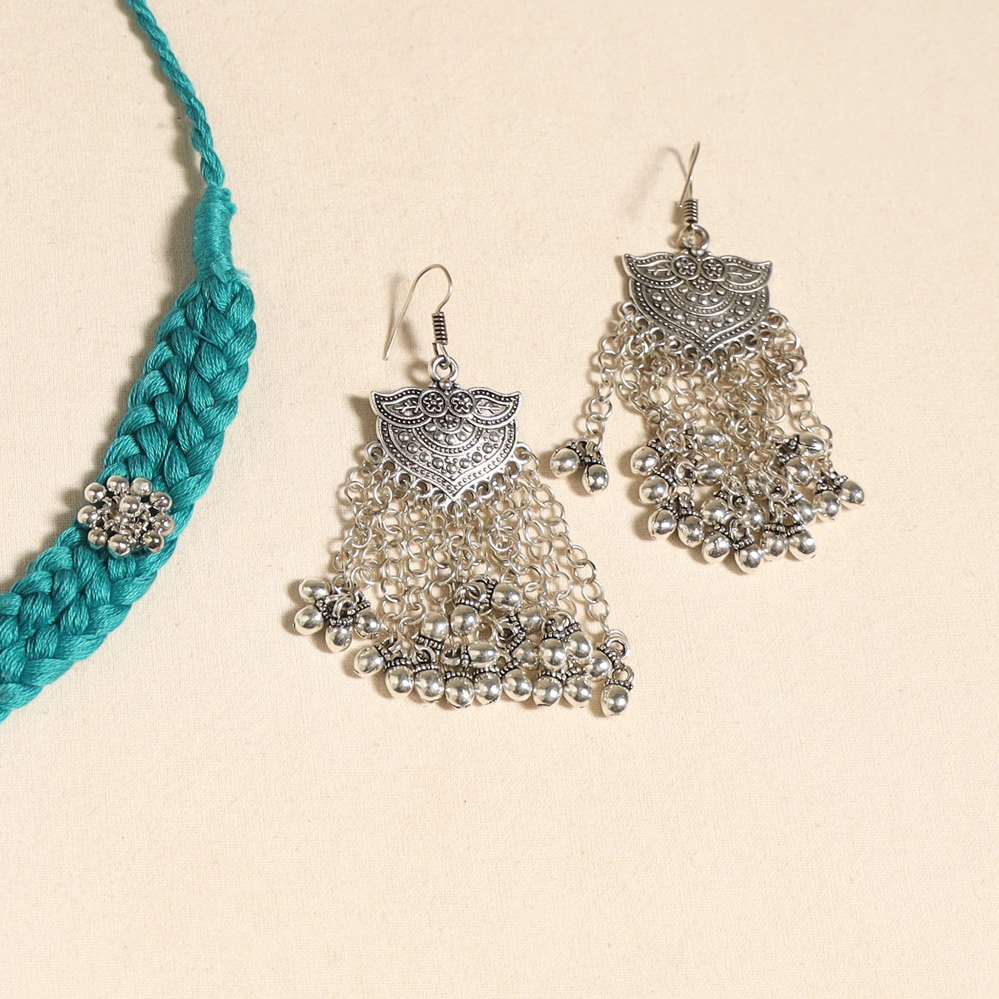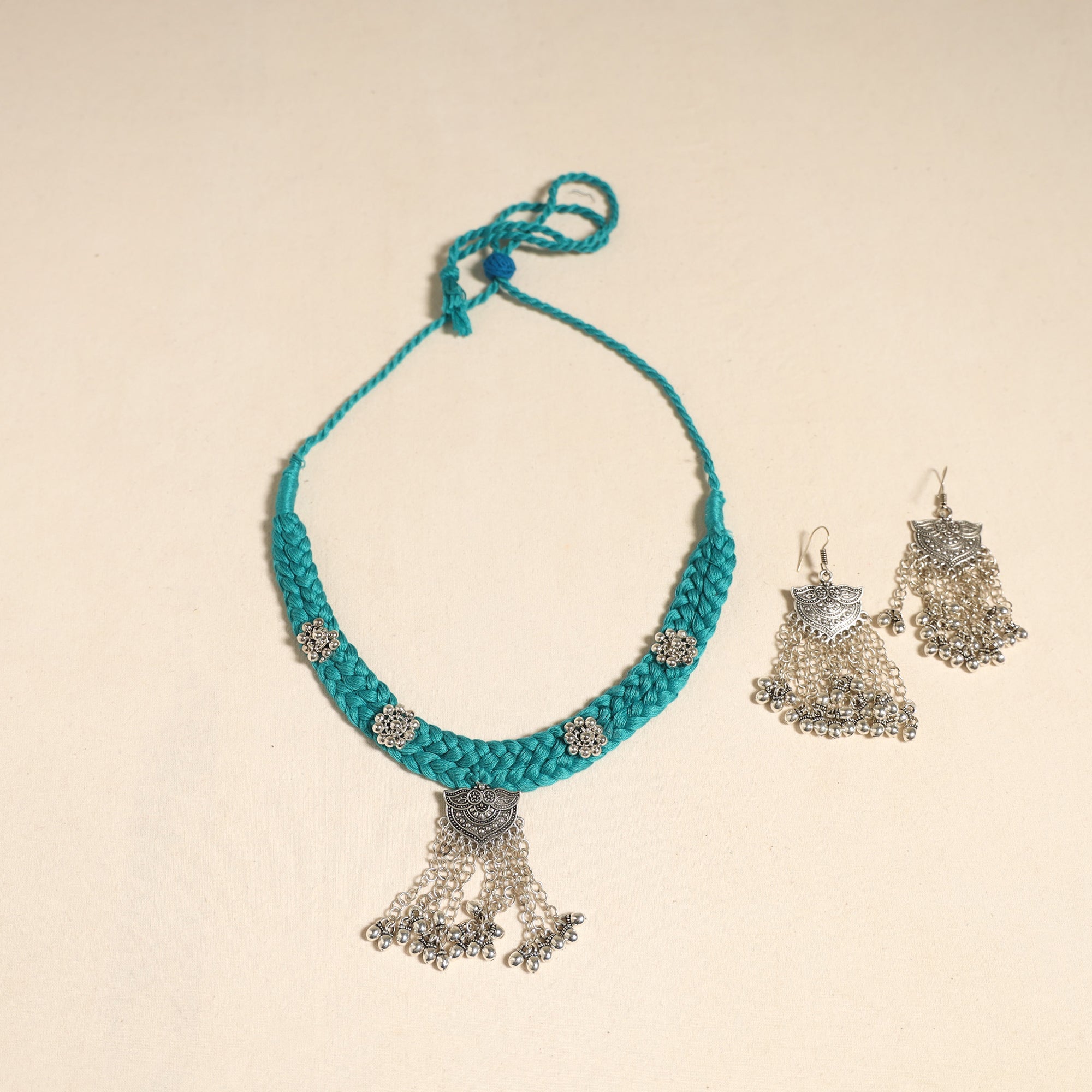 Add a touch of handmade charm to your ensemble with this elegant blue german silver necklace set. The set comes complete with matching earrings to effortlessly elevate your traditional or Indo-fusion look. Handcrafted by skilled artisans, it is perfect for festive occasions, cultural functions, or simply for adding a unique flair to your everyday style. It also makes a thoughtful gift for your loved ones.