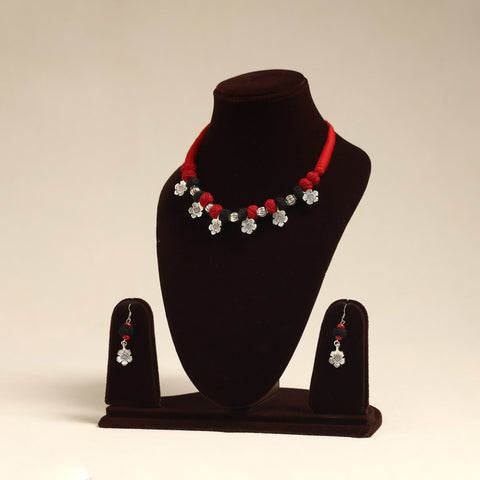 Add a touch of handmade charm to your ensemble with this elegant red german silver necklace set, beautifully accented with colorful thread beads. The set comes complete with matching earrings to effortlessly elevate your traditional or Indo-fusion look. Handcrafted by skilled artisans, it is perfect for festive occasions, cultural functions, or simply for adding a unique flair to your everyday style. It also makes a thoughtful gift for your loved ones.