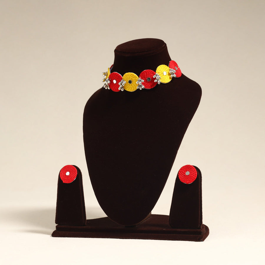Add a touch of handmade charm to your ensemble with this elegant red threadwork necklace set, beautifully accented with ghungroos and mirrors. The set comes complete with matching earrings to effortlessly elevate your traditional or Indo-fusion look. Handcrafted by skilled artisans, it is perfect for festive occasions, cultural functions, or simply for adding a unique flair to your everyday style. It also makes a thoughtful gift for your loved ones.