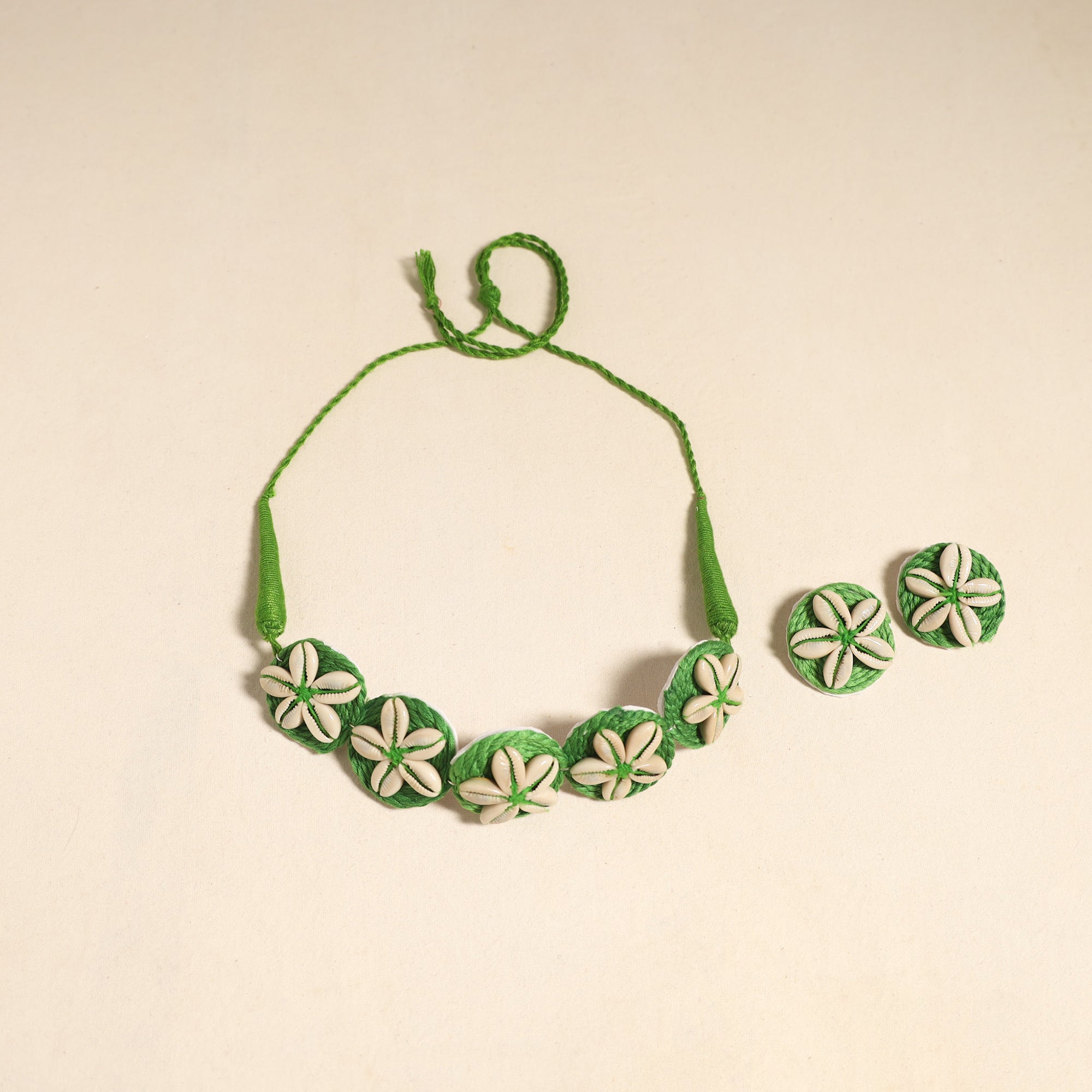 Add a touch of handmade charm to your ensemble with this elegant green thread and shell work necklace set. It comes with matching earrings to effortlessly enhance your traditional or Indo-fusion look. Handcrafted by skilled artisans, it's ideal for festive gatherings, cultural events, or to bring a unique flair to your everyday style. It also makes a meaningful gift for your loved ones.