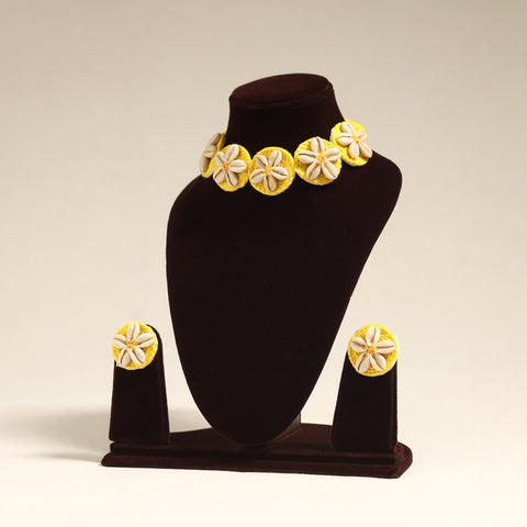 Add a touch of handmade charm to your ensemble with this elegant yellow thread and shell work necklace set. It comes with matching earrings to effortlessly enhance your traditional or Indo-fusion look. Handcrafted by skilled artisans, it's ideal for festive gatherings, cultural events, or to bring a unique flair to your everyday style. It also makes a meaningful gift for your loved ones.